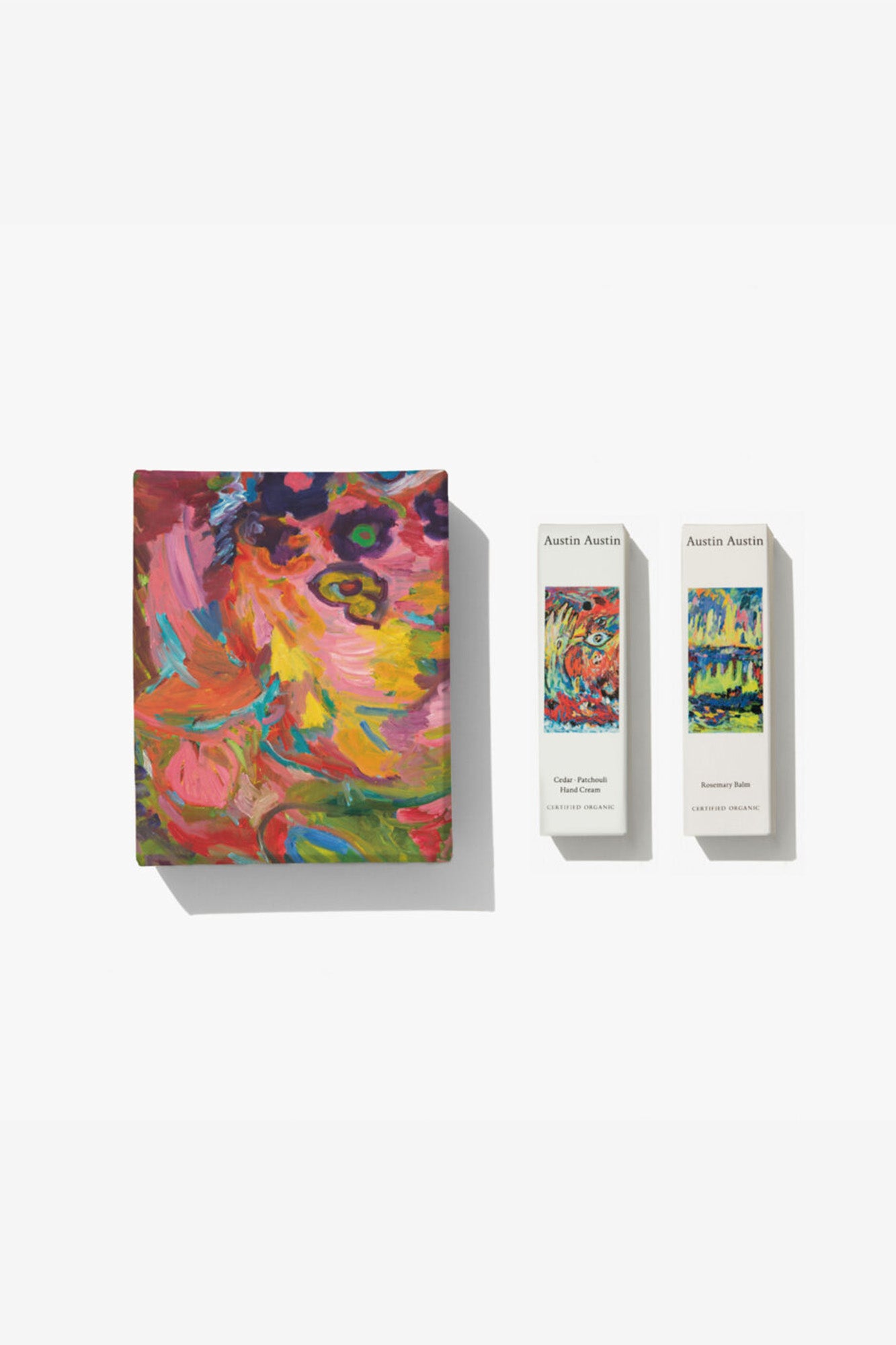 Rosemary Balm and Cedar & Patchouli Hand Cream in a gift box with print by artist Adrianne Rubenstein.