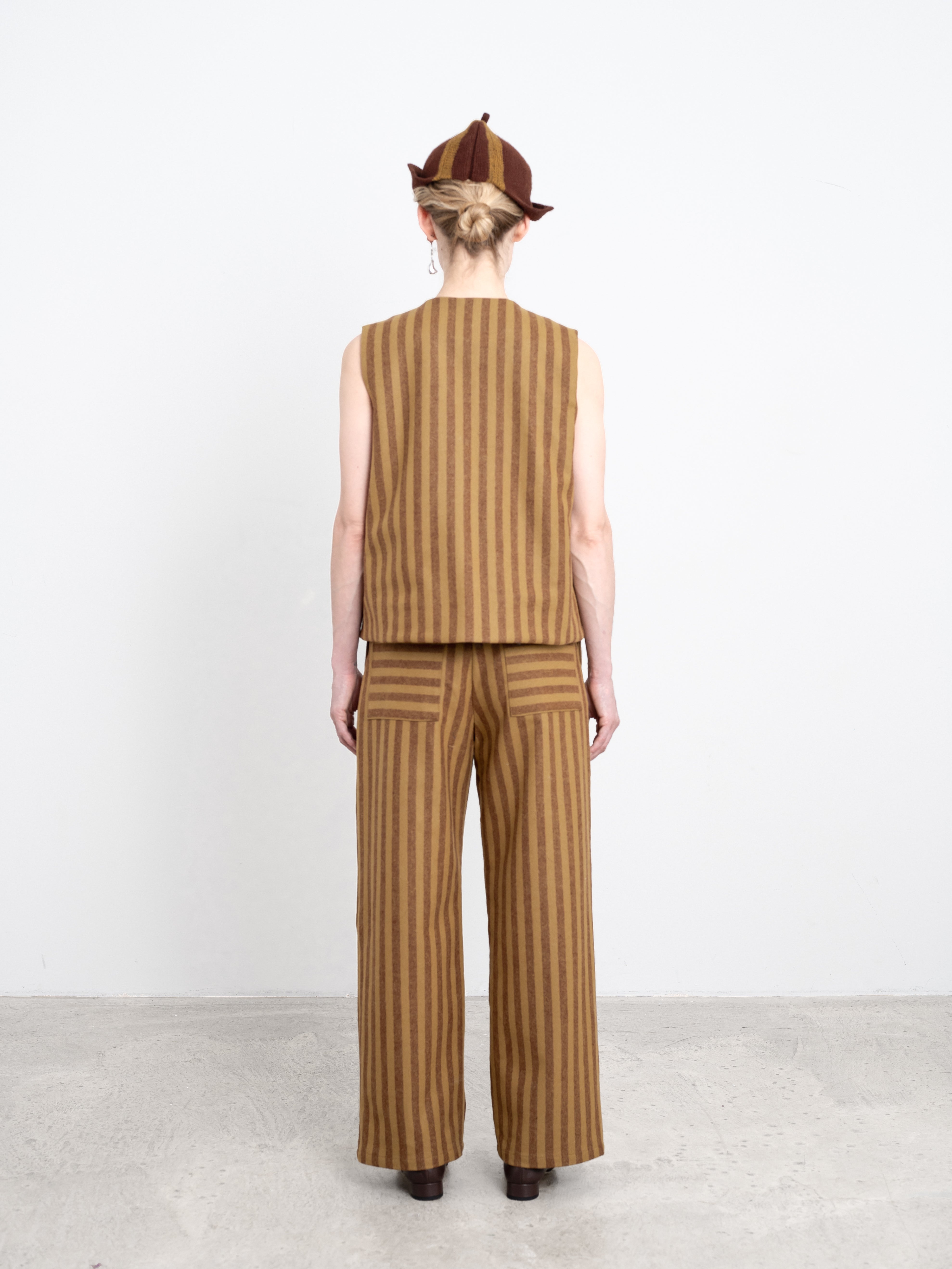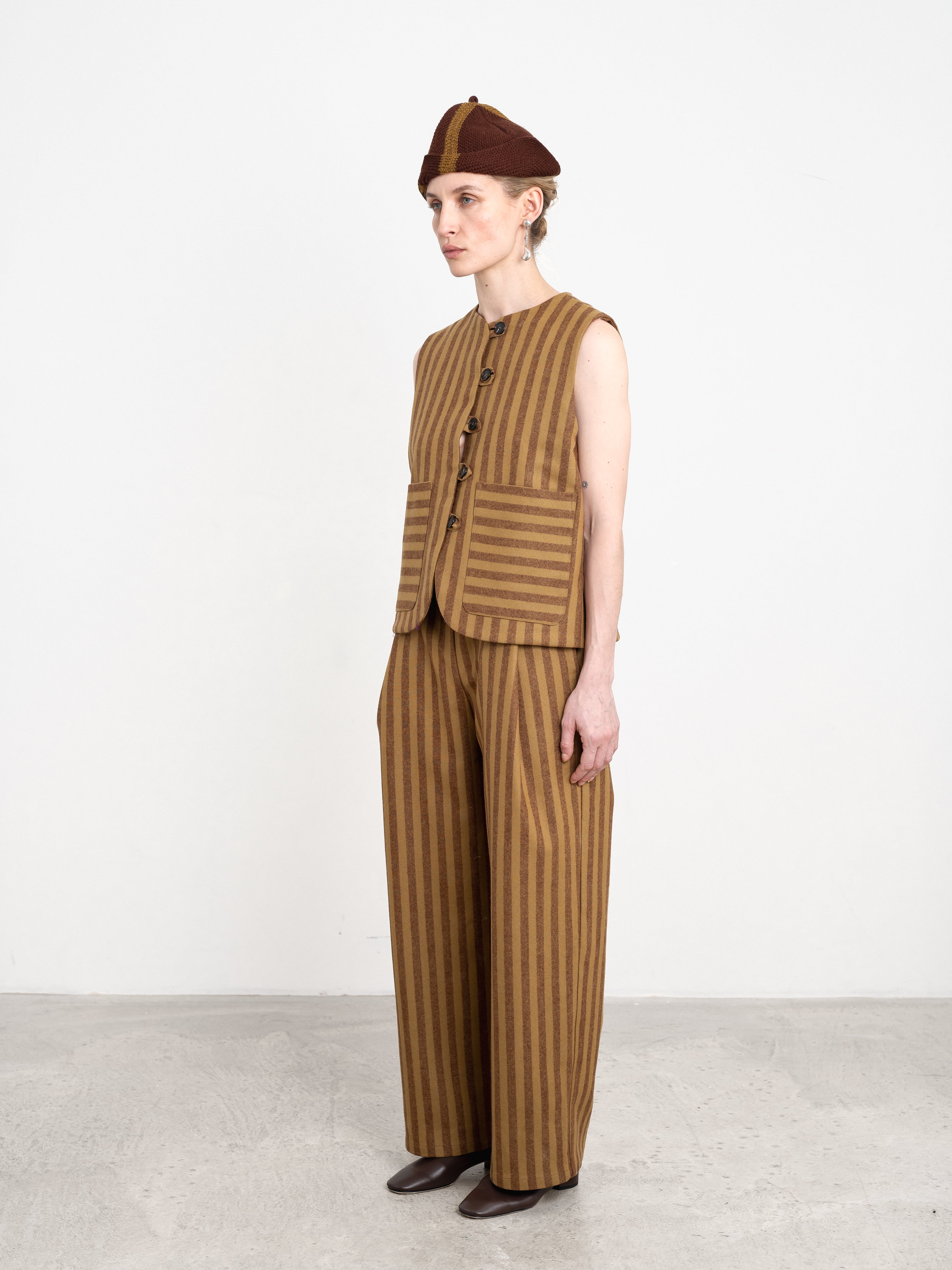 A BOXY FIT VEST MADE FROM A PORTUGUESE STRIPED WOOL AND LINED IN A SMOOTH VISCOSE LINING. DETAILED WITH A CURVED HEM, HORIZONTAL STRIPED PATCH POCKETS, BUTTON AND LOOP CLOSURE AND HIGH NECKLINE.