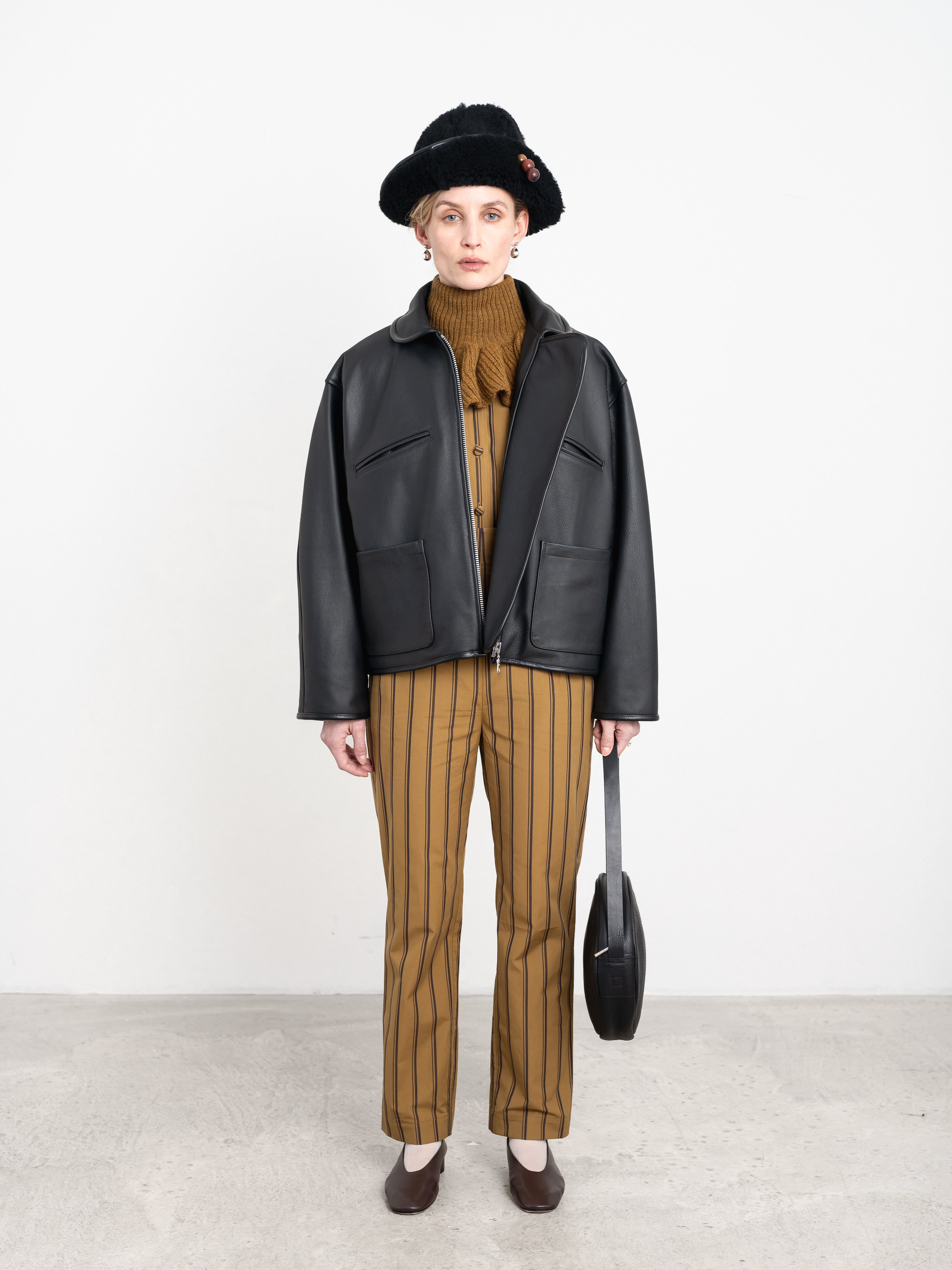 INSPIRED BY VINTAGE AVIATION JACKETS, THE LEATHER FLYING JACKET HAS A LOOSE AND SEMI CROPPED SILHOUETTE. CUT FROM SOFT BLACK LEATHER, THE JACKET IS FINISHED WITH TWO PATCH POCKETS, CHEST JET POCKETS, MATCHING LEATHER BINDING AND AN OVERLAPPING ZIP CLOSURE. THE PURPOSEFUL ROOMY FIT ALLOWS YOU TO WRAP UP IN THE COOLER MONTHS.