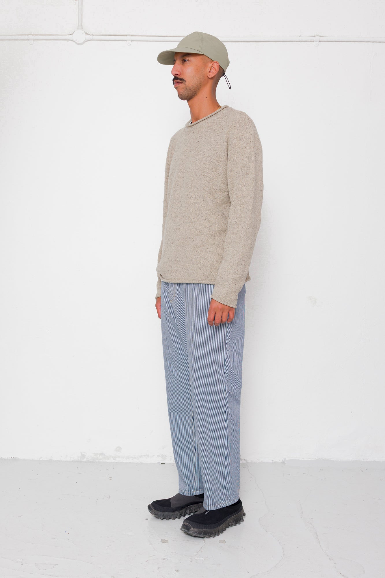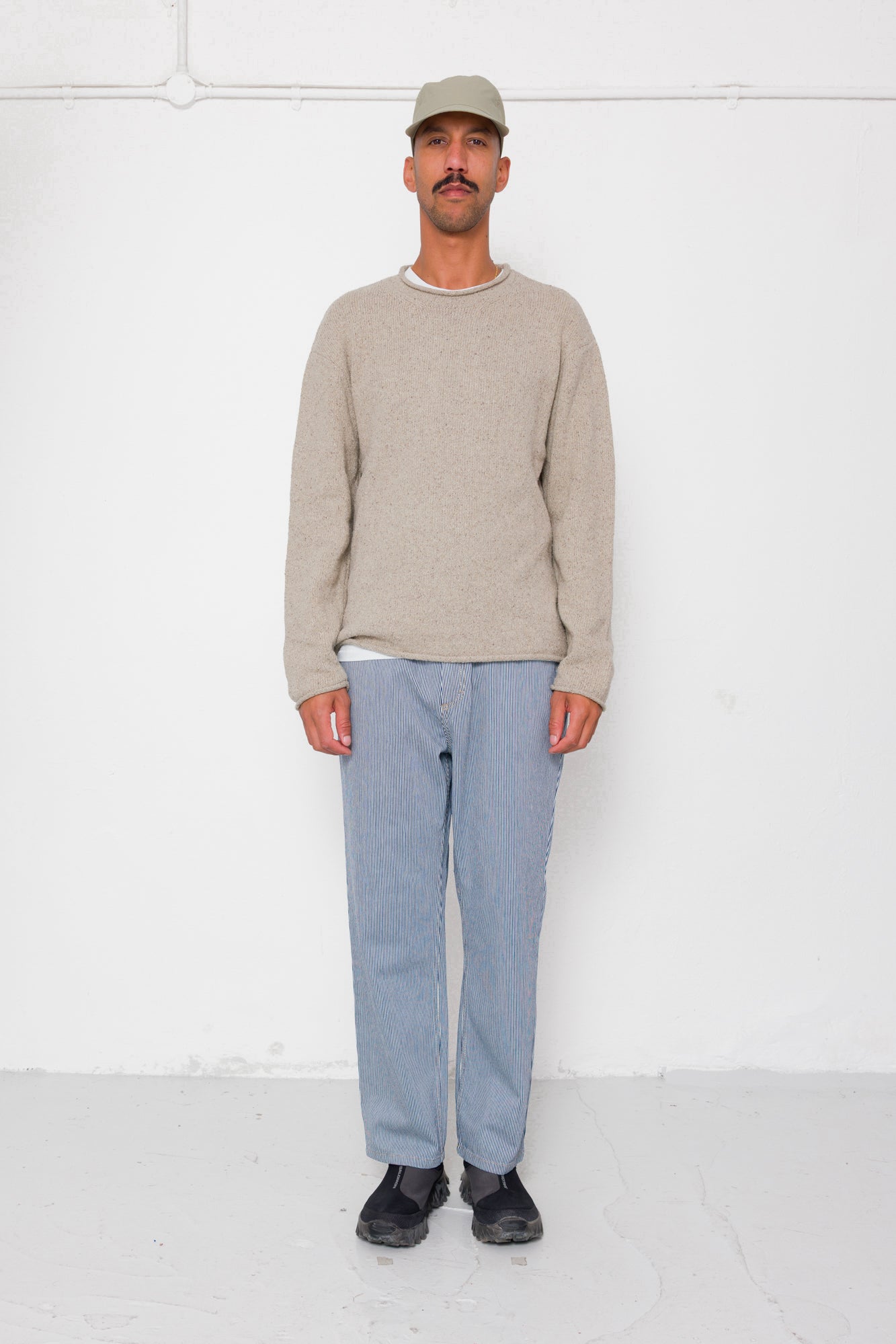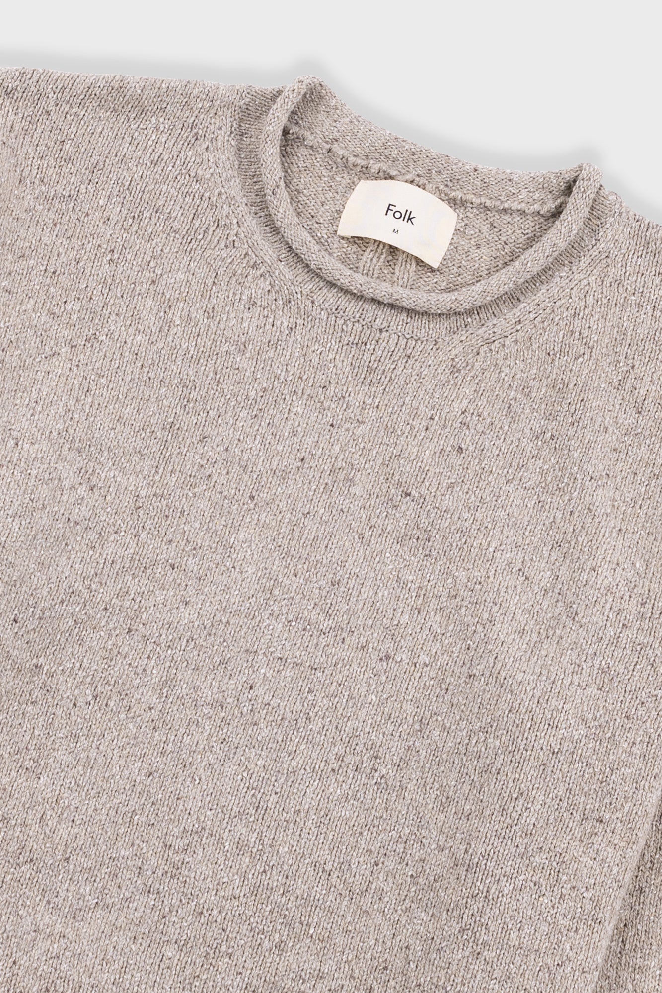 An easy wear layer for the warmer months, designed with raw cast off seems for a relaxed, natural look. This garment is made using summery cotton linen blended yarns and has nep detailing across its surface.