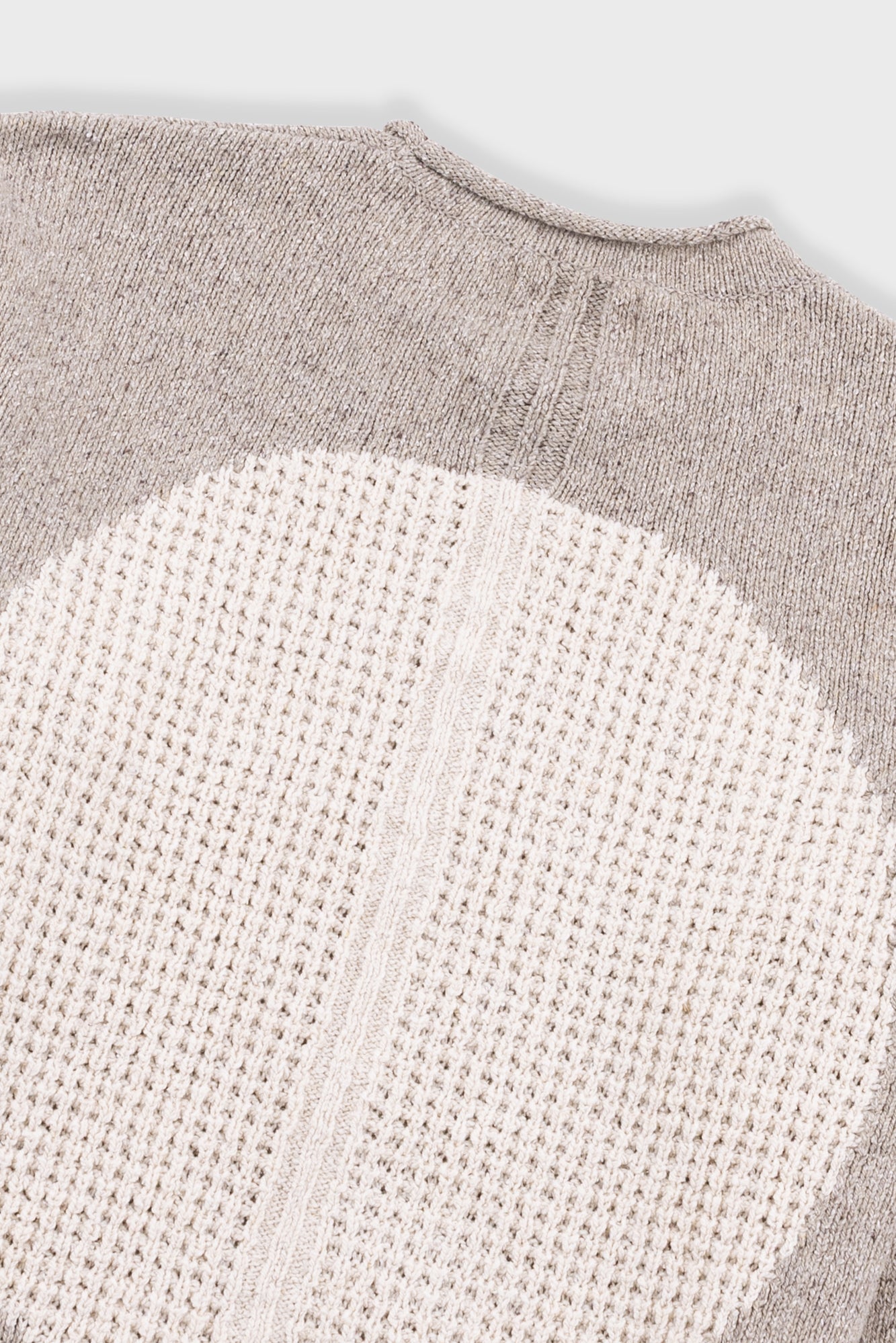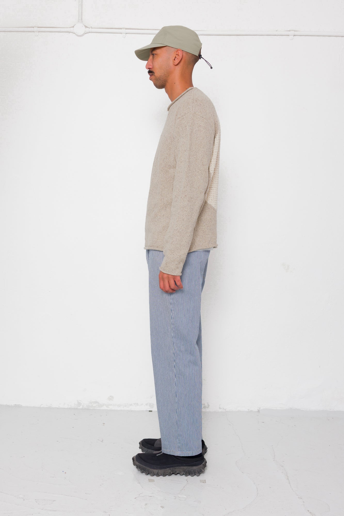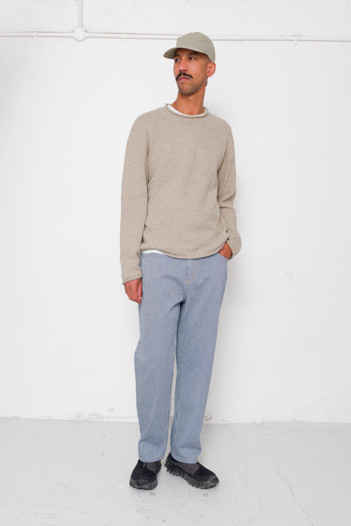 An easy wear layer for the warmer months, designed with raw cast off seems for a relaxed, natural look. This garment is made using summery cotton linen blended yarns and has nep detailing across its surface.