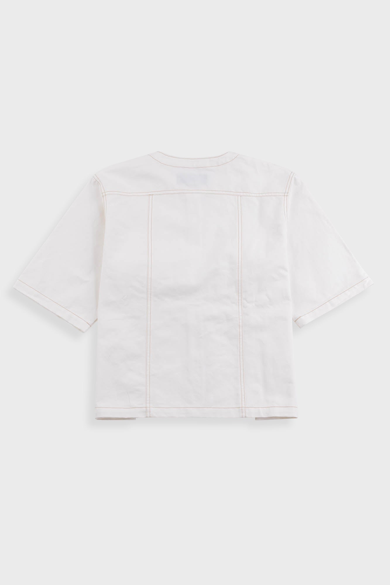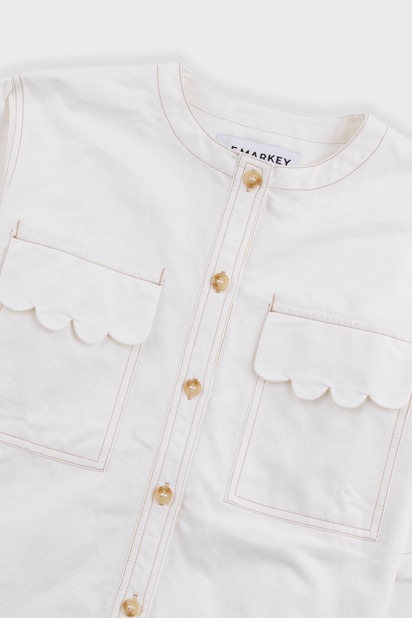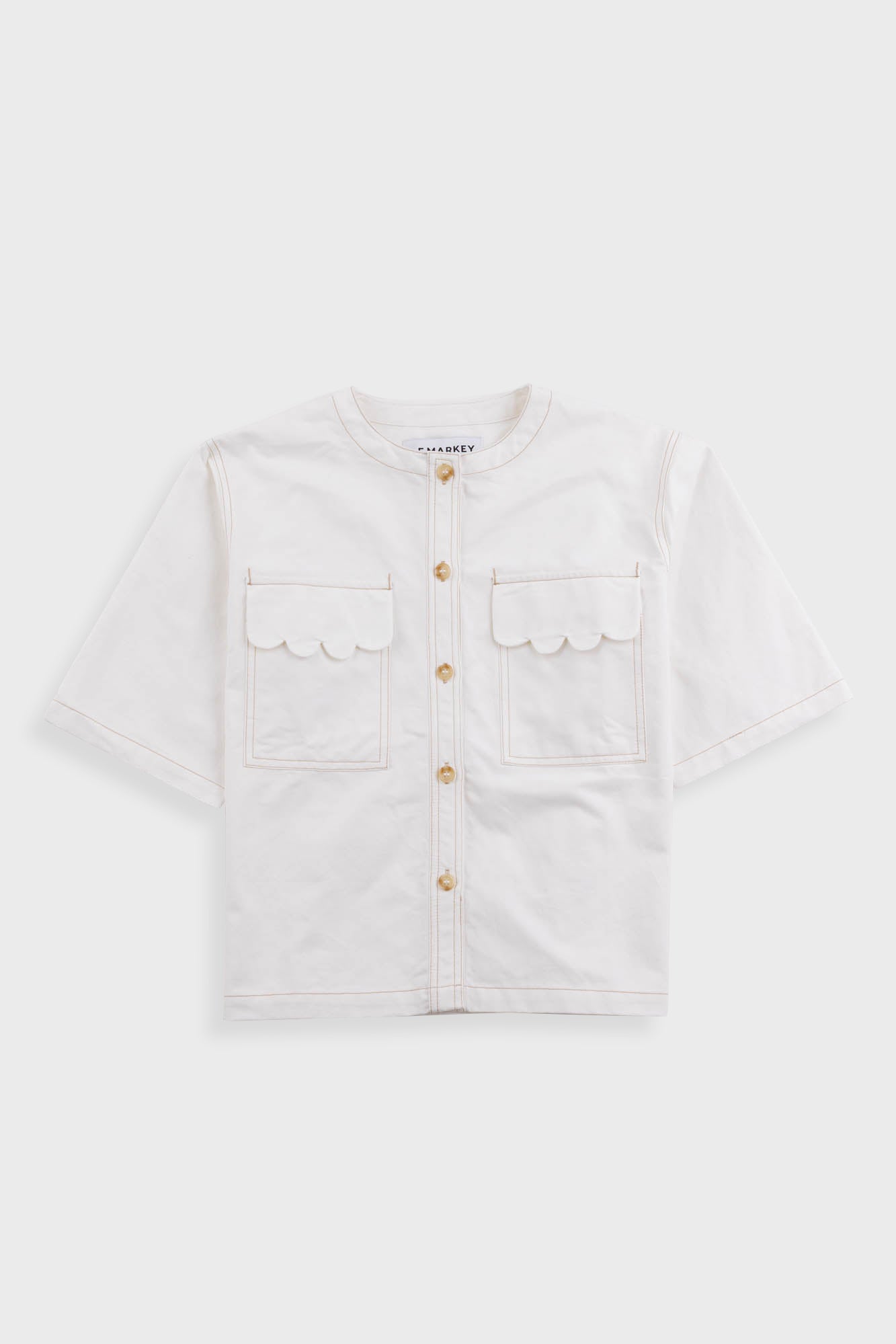 The Alwyn Top is a boxy, square cut top with a round neckline and imitation horn buttons down the front. Made in a structured cotton twill, with two front chest pockets and contrast ochre stitching throughout. 100% Cotton Twill. Machine wash on a cold gentle cycle with similar colours.
