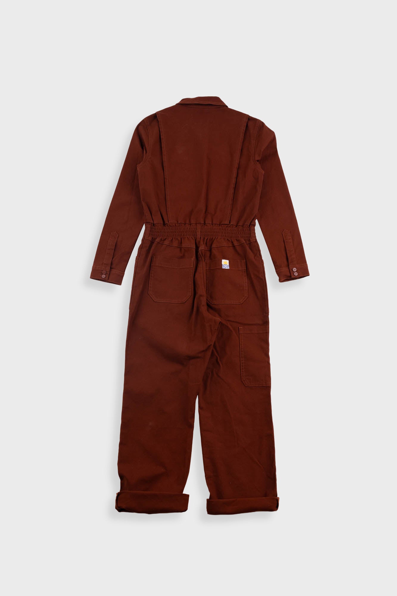 Dark Rust version of our classic fitted boilersuit. Elasticated at the waist with wide, straight legs. In heavy-weight cotton canvas with a small amount of stretch for a better fit. 97% Cotton, 3% Elastane. Machine wash on a cold gentle cycle with similar colours.