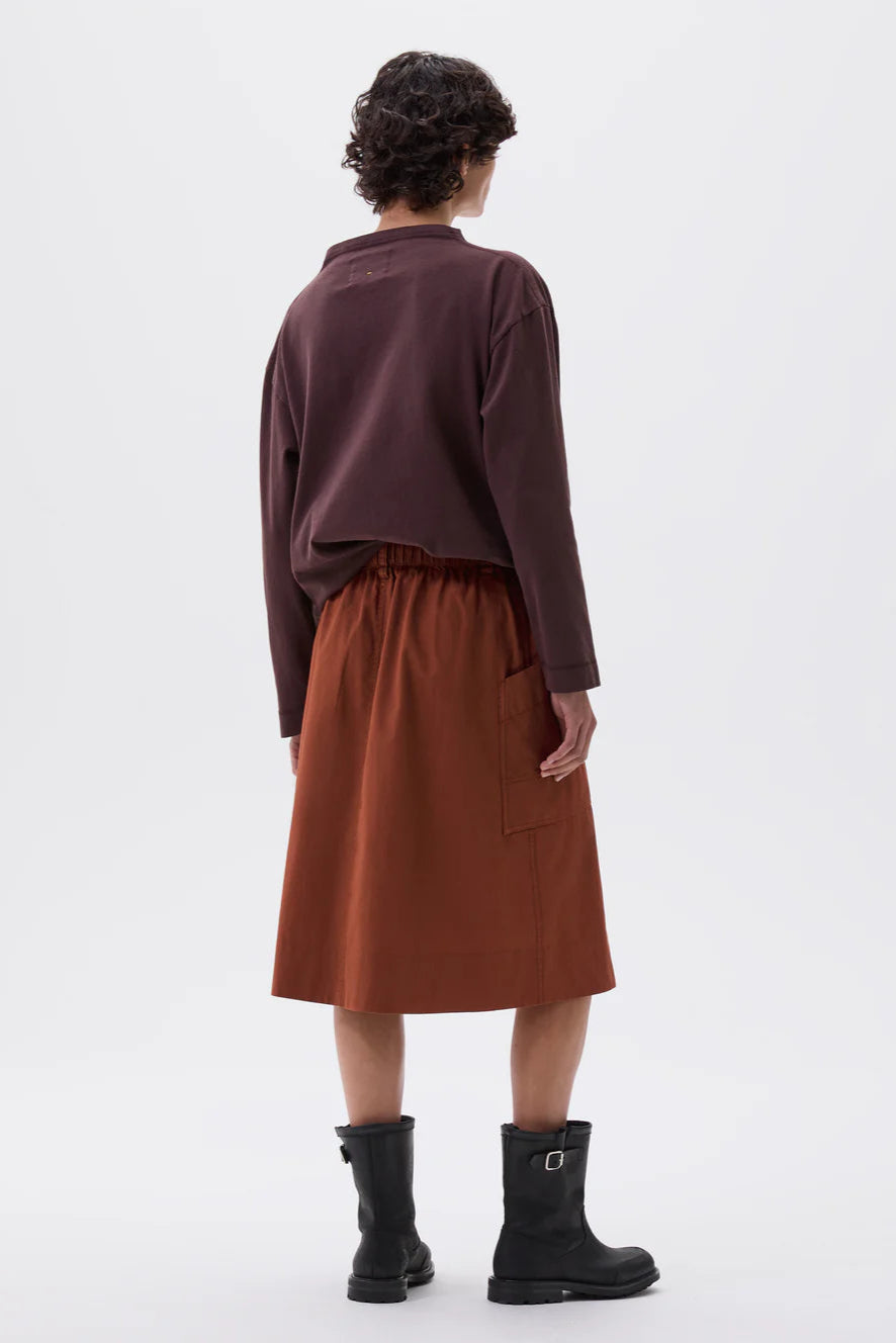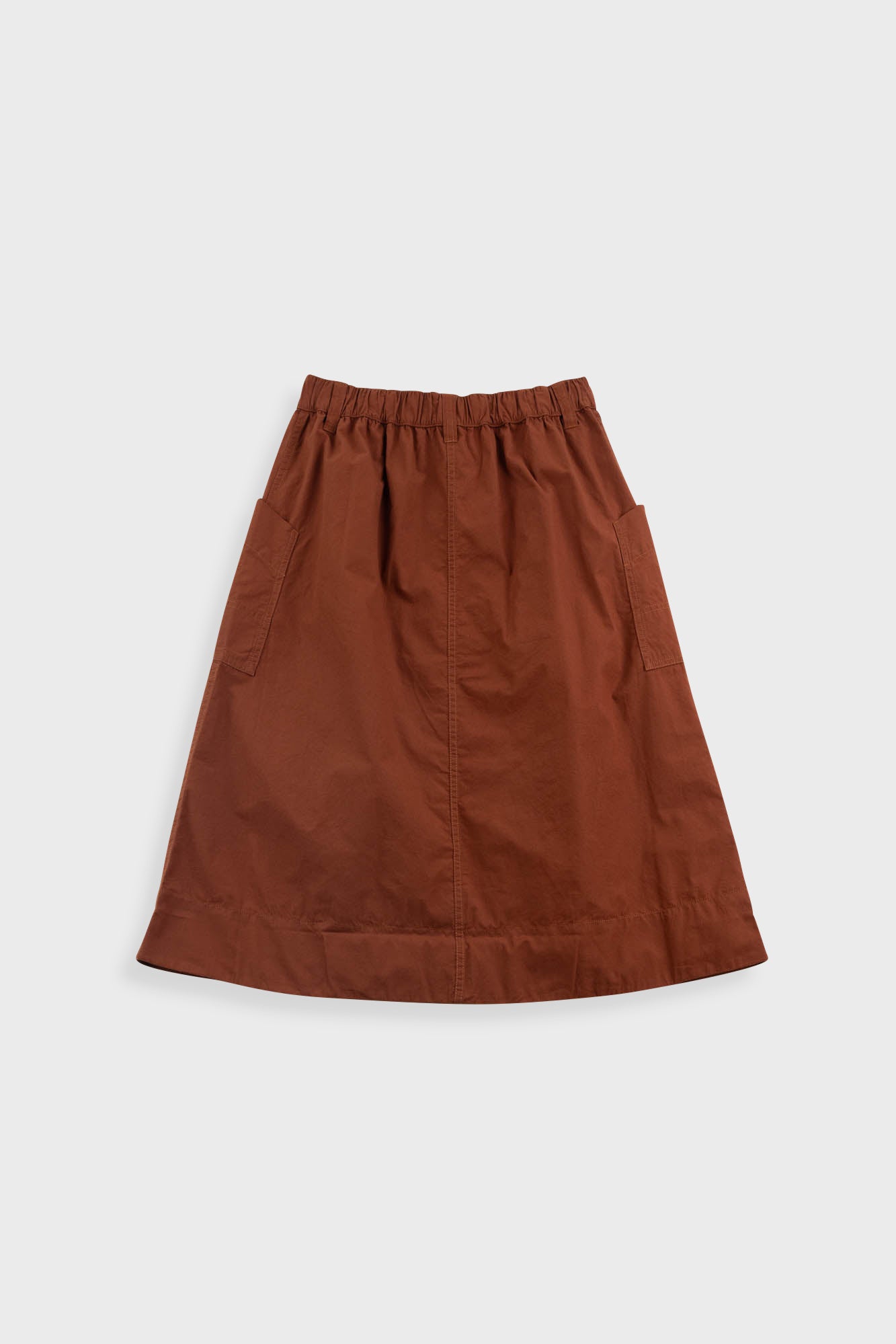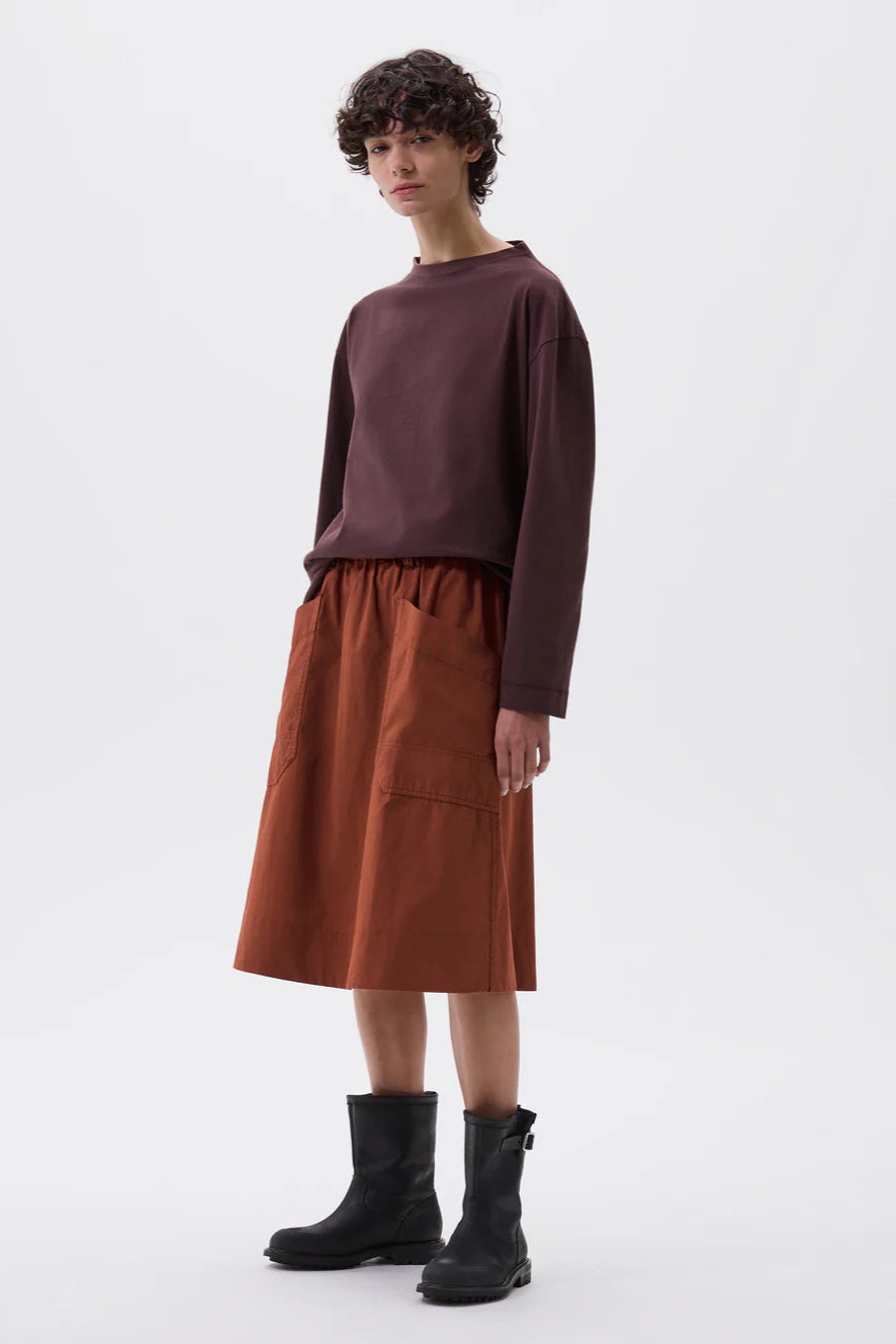 The MHL. Patch Pocket Skirt has a relaxed cut and midi length, and is fabricated in lightweight mill washed cotton poplin with soft, papery hand feel, in colours developed exclusively for MHL. Informed by the silhouette of a vintage apron, the skirt is constructed with an elasticated waist with a herringbone tape drawcord and large, slant patch pockets with reinforced stitch detailing.