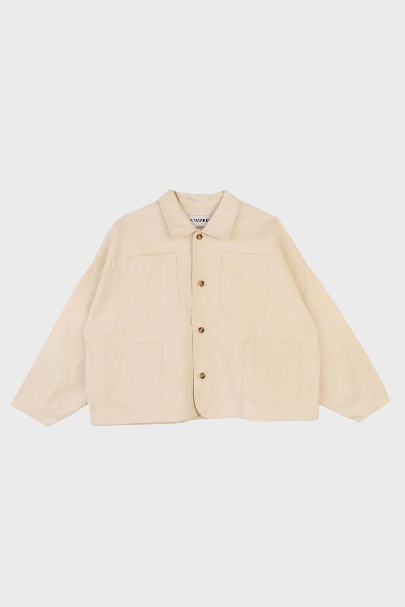 Cut to a boxy silhouette, it retains the pragmatic codes of its origins with utility-style patch pockets and sturdy imitation horn buttons.