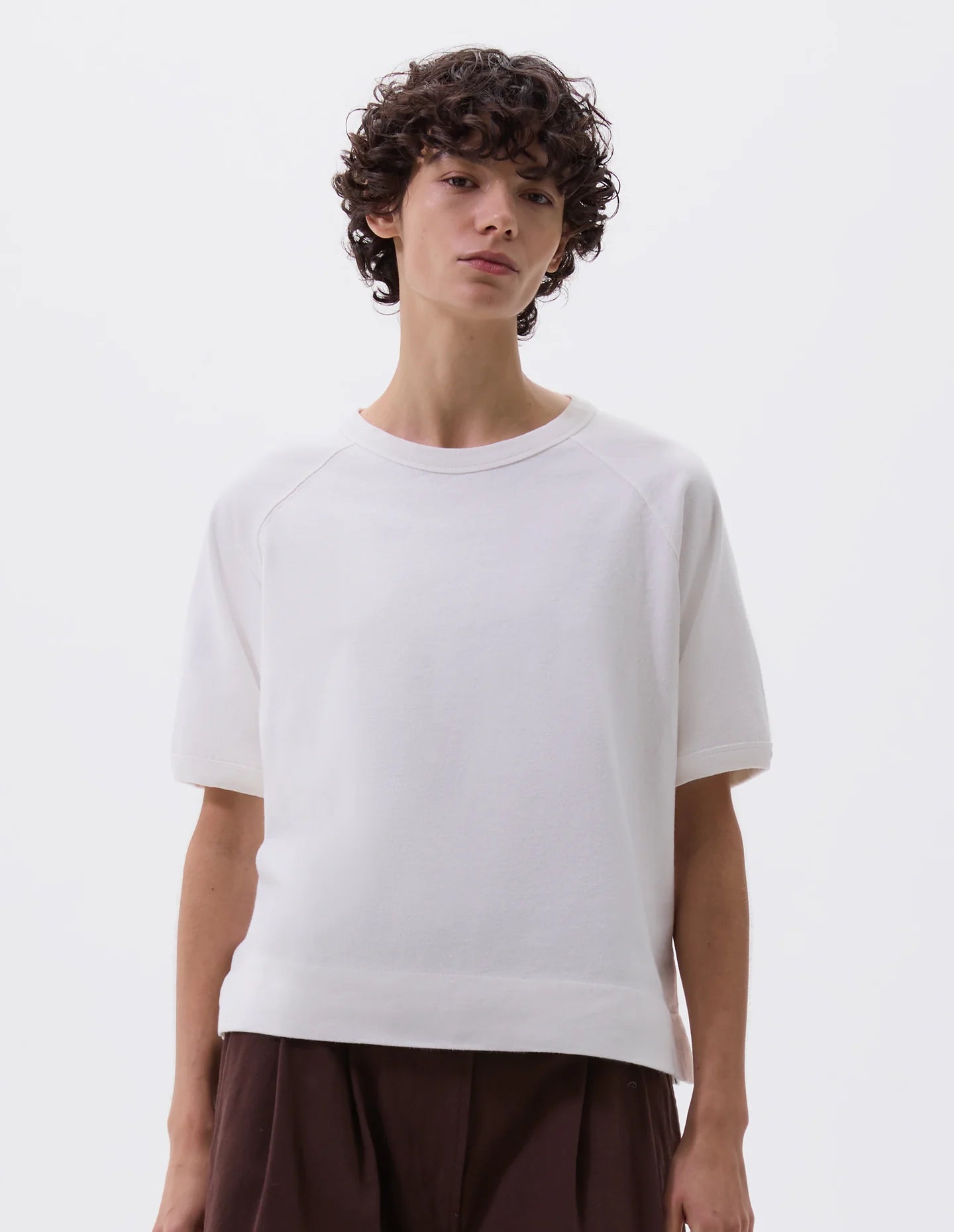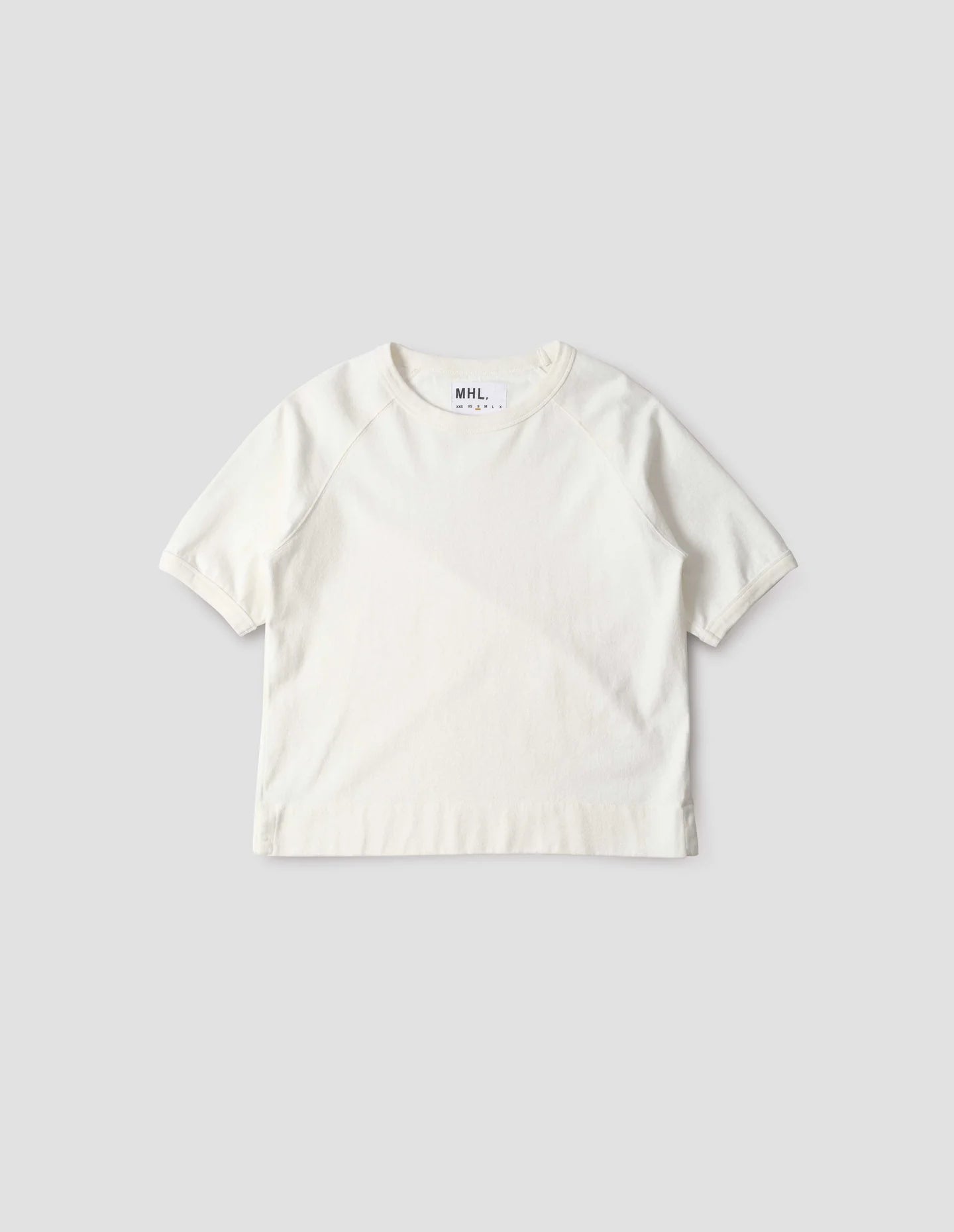 The MHL. Raglan Gym Top has a regular cut and is fabricated in textured cotton jersey with a dry hand feel. The top is finished with ribbed binding on the neck and cuffs, a vent split hem with herringbone tape detailing, twin needle stitch detailing and half moon stitch detailing on the back yoke.