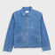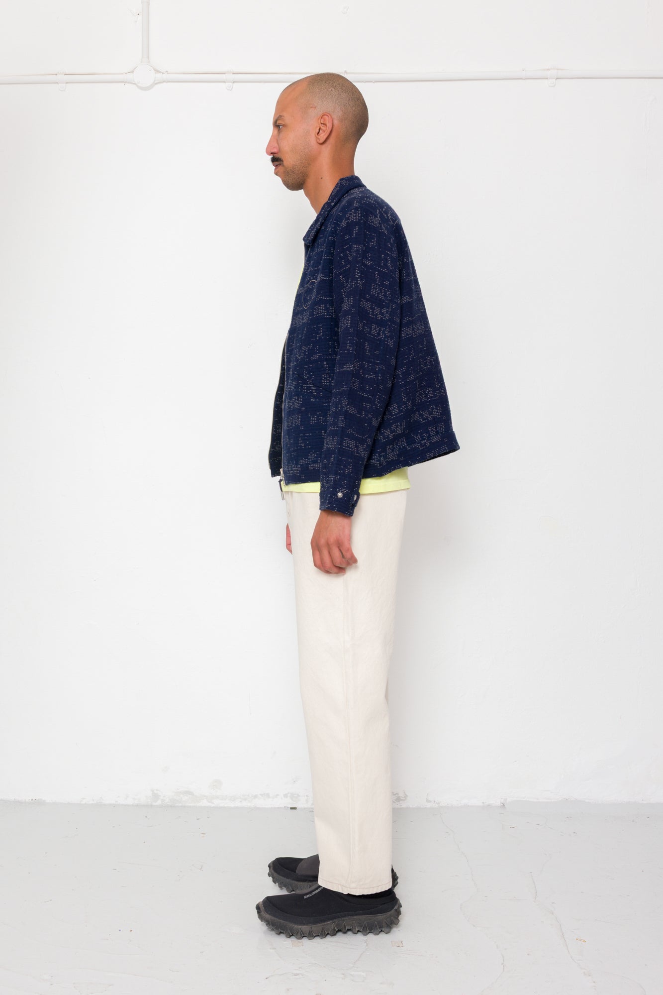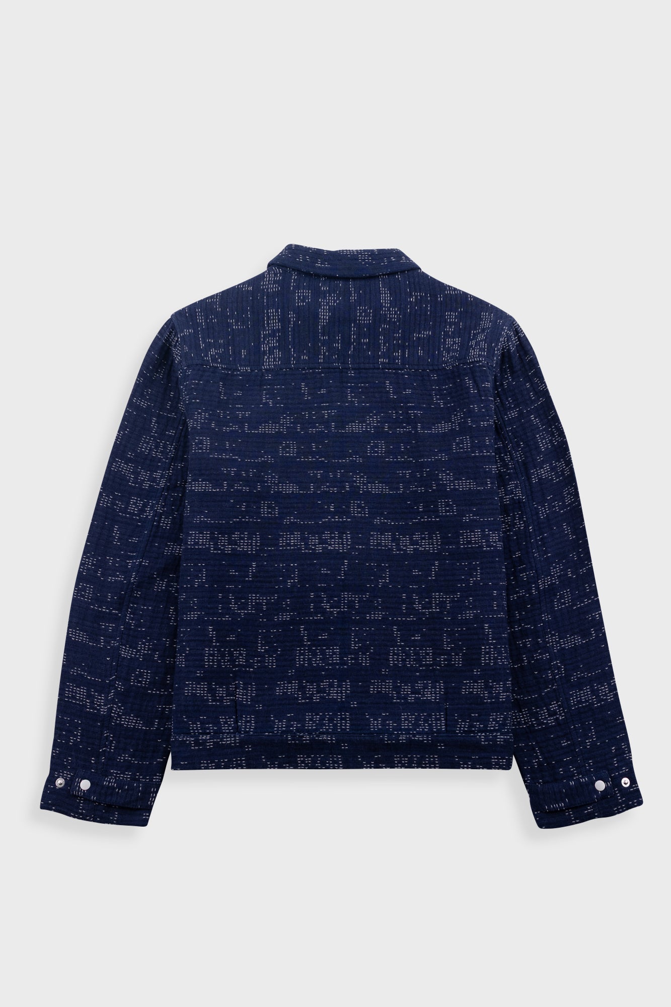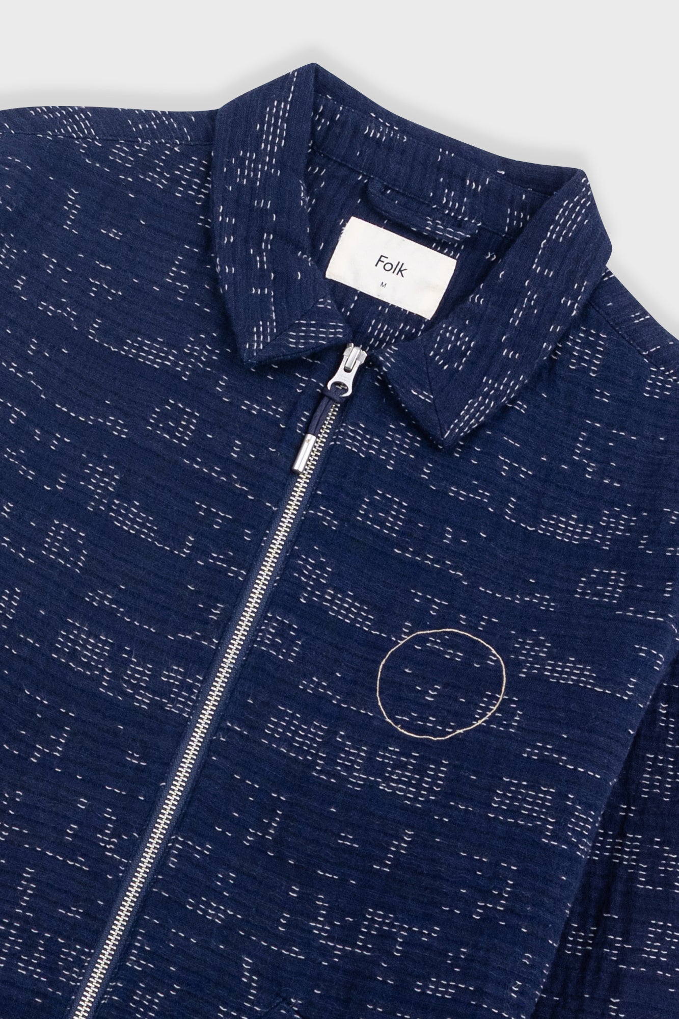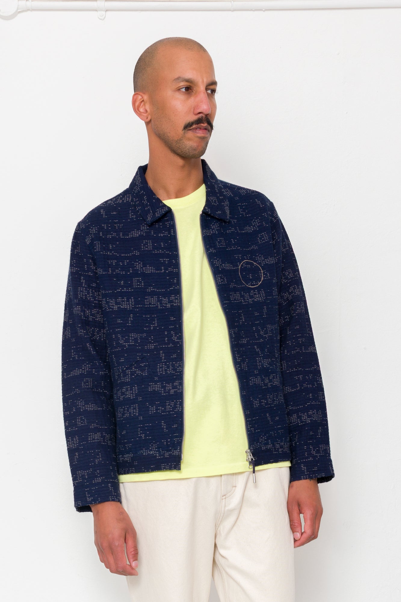 A casual, zip through jacket, constructed in an indigo dyed fabric with float stitch detail.