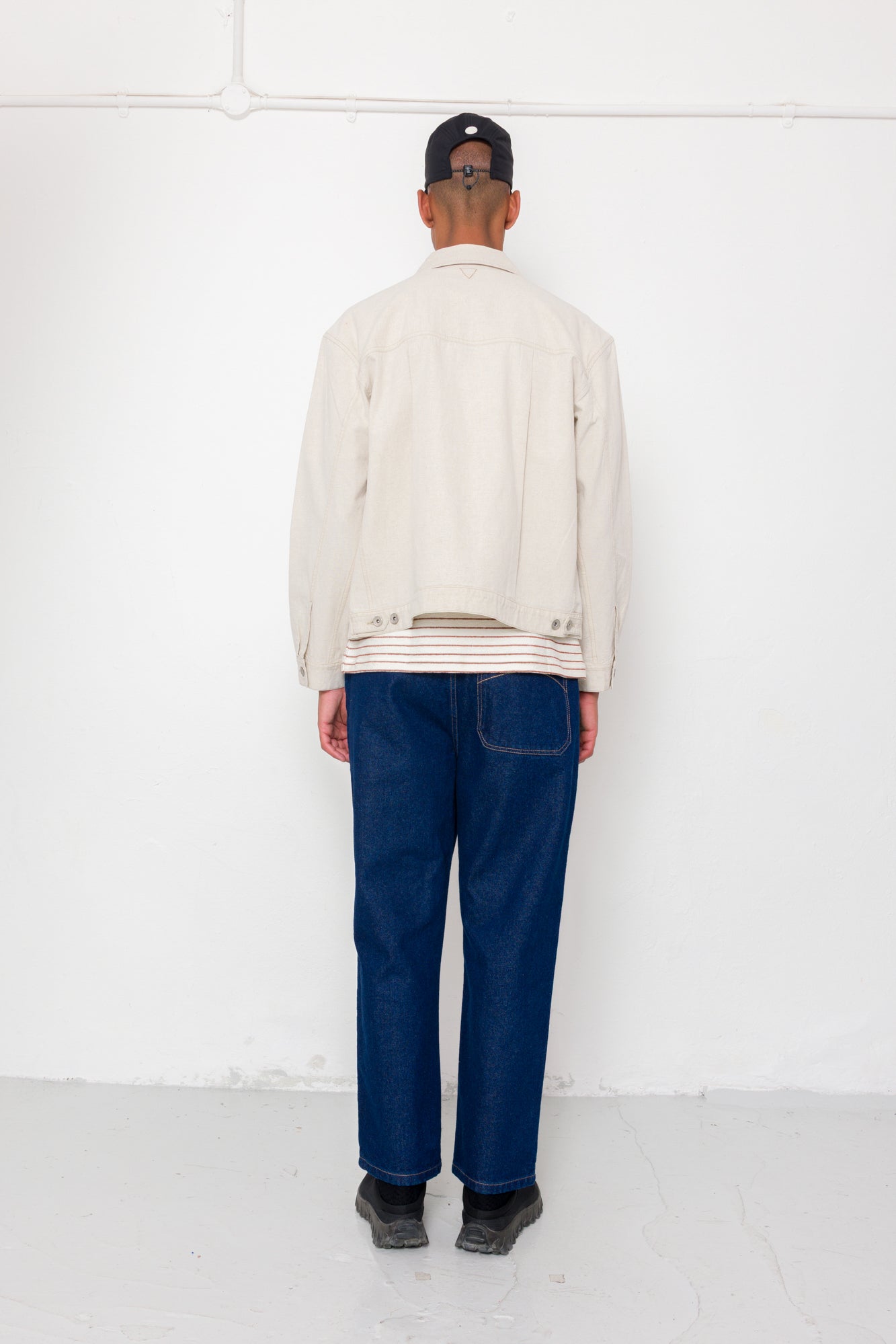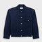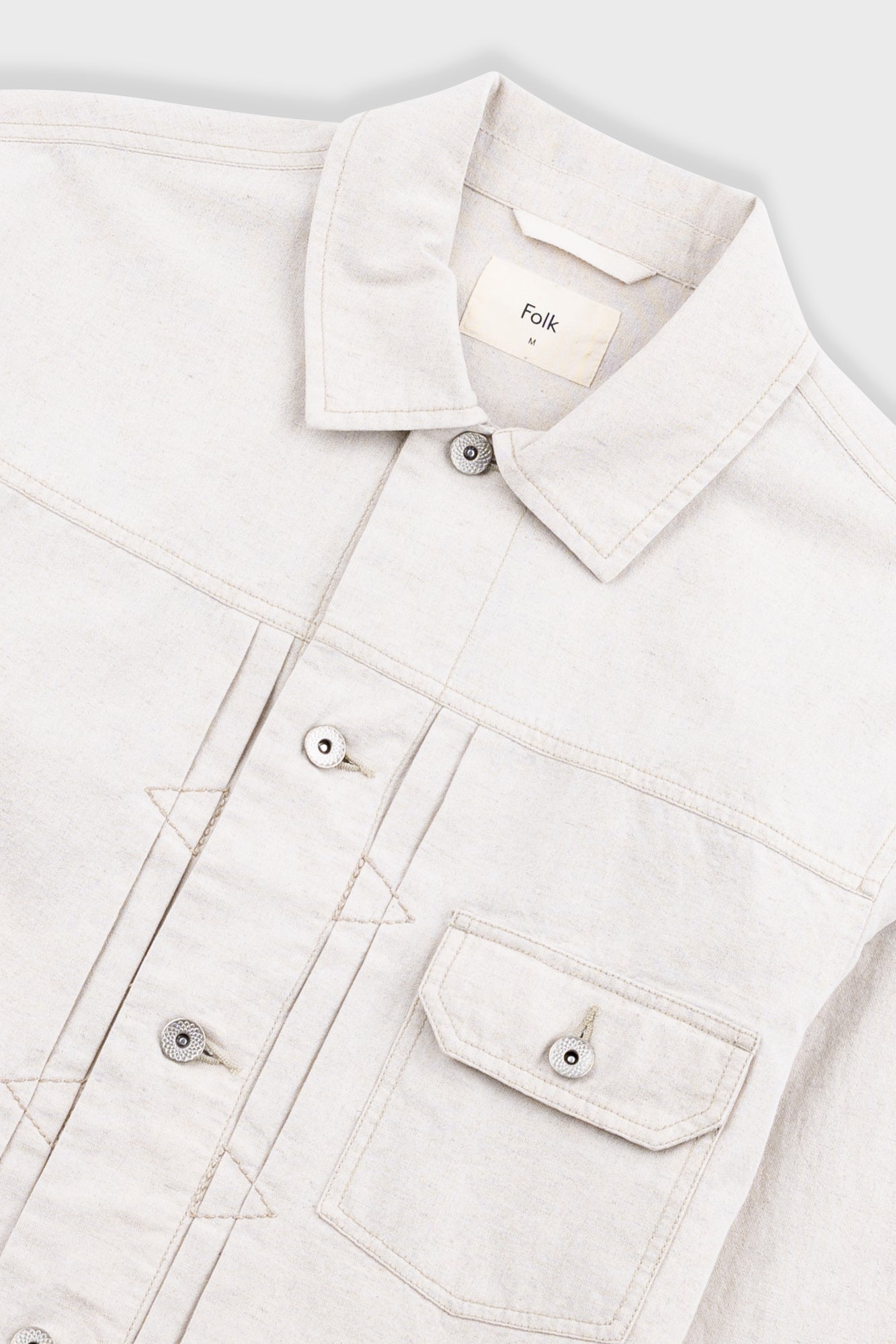 Boxy fitting jean style jacket with triangular embroidery stitch details. It has been constructed in a linen cotton blend fabric with dry, soft handfeel which has been garment washed to enhance naturally textured character. Made with 53% recycled cotton fibres.