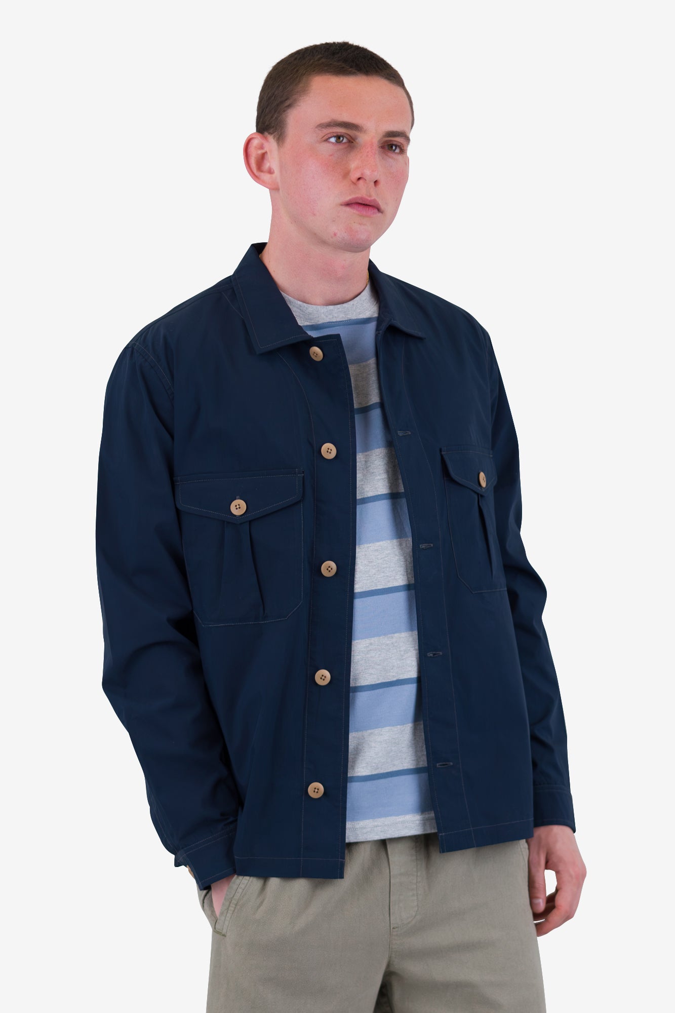 - Corozo nut button closure at centre front, pockets and cuffs.