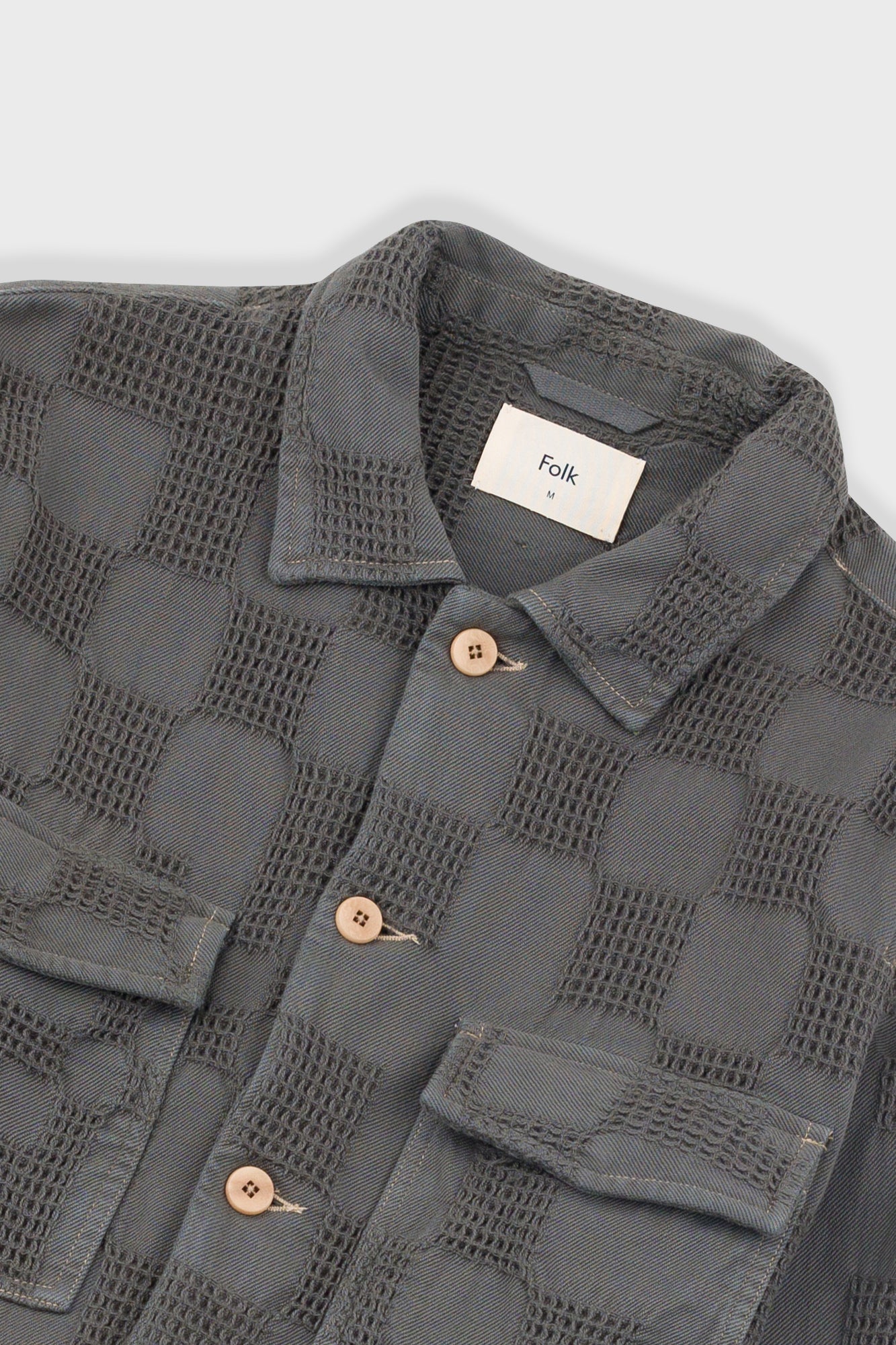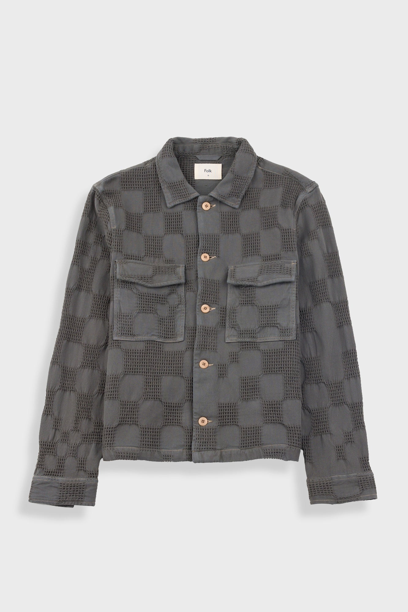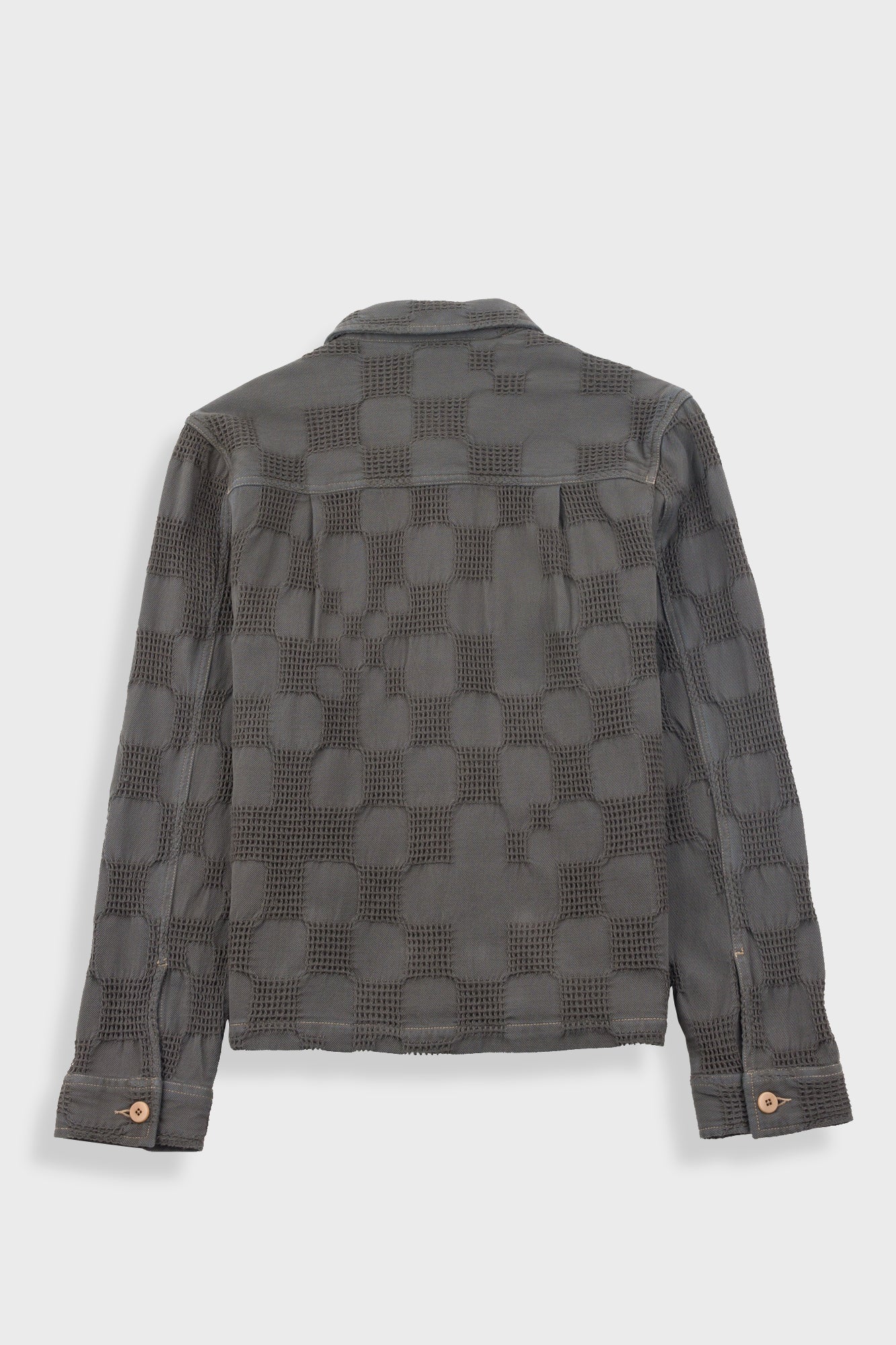 Zaki Jacket. Boxy fit, casual jacket style with straight hem. This fabric has mixed checkerboard design in a combination of waffle and twill weave structures.