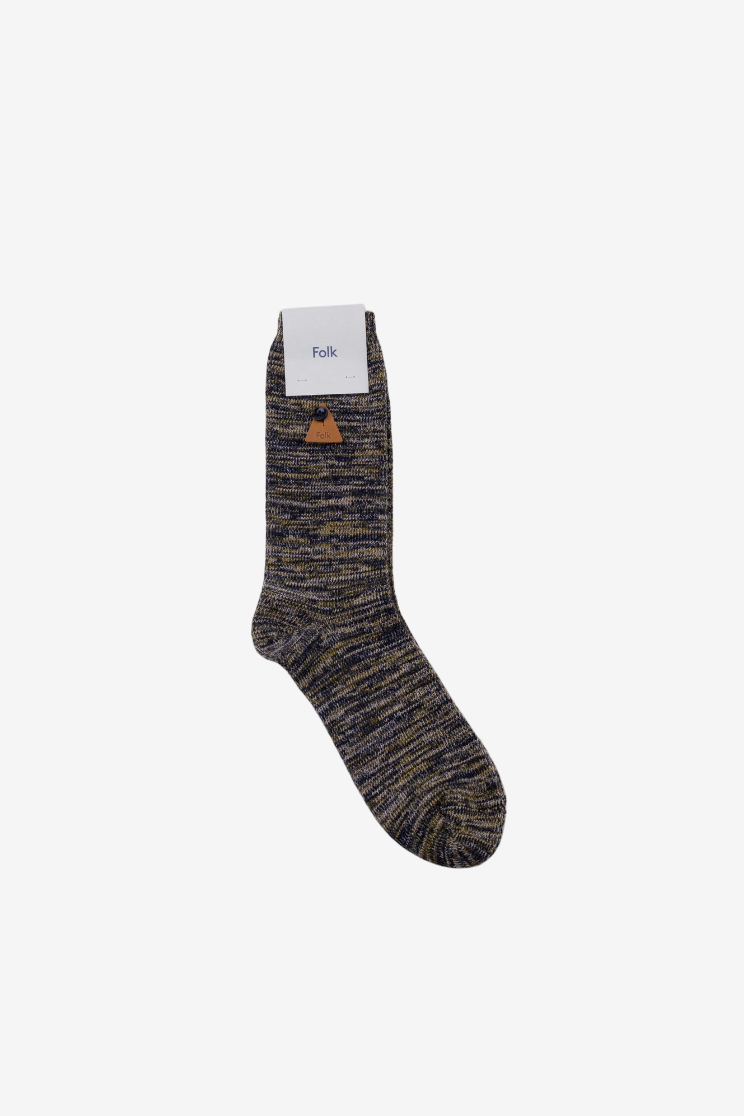 Super soft cotton blend socks. Single jersey stitch construction in organic cotton yarn. Mix of different yarn colours used together based on our Autumn Winter palette. Finished with Corozo button and faux leather triangular Folk tab.