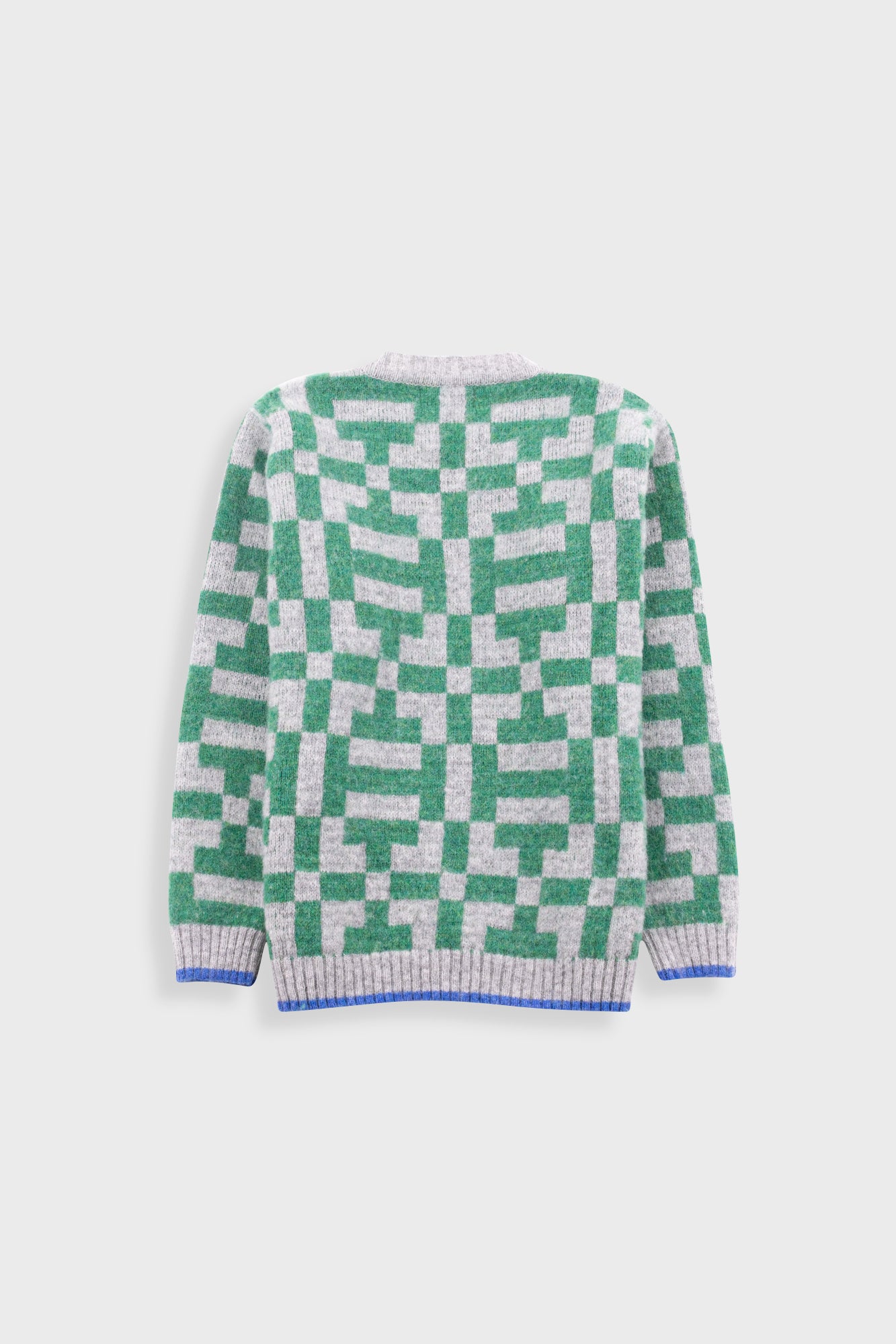 The Fara Jumper is made from 100% wool. This style is made using traditional seam-free knitting machines meaning there no waste is created in the production. This style features a striking geometric intarsia pattern in two colours with a contrast colour tipping. The surface of this style has been brushed giving is a cosy, fuzzy texture. This silhouette is slightly oversized, if a slimmer fit is preferred then it is possible to size down. This style is part of our 10-year collection.