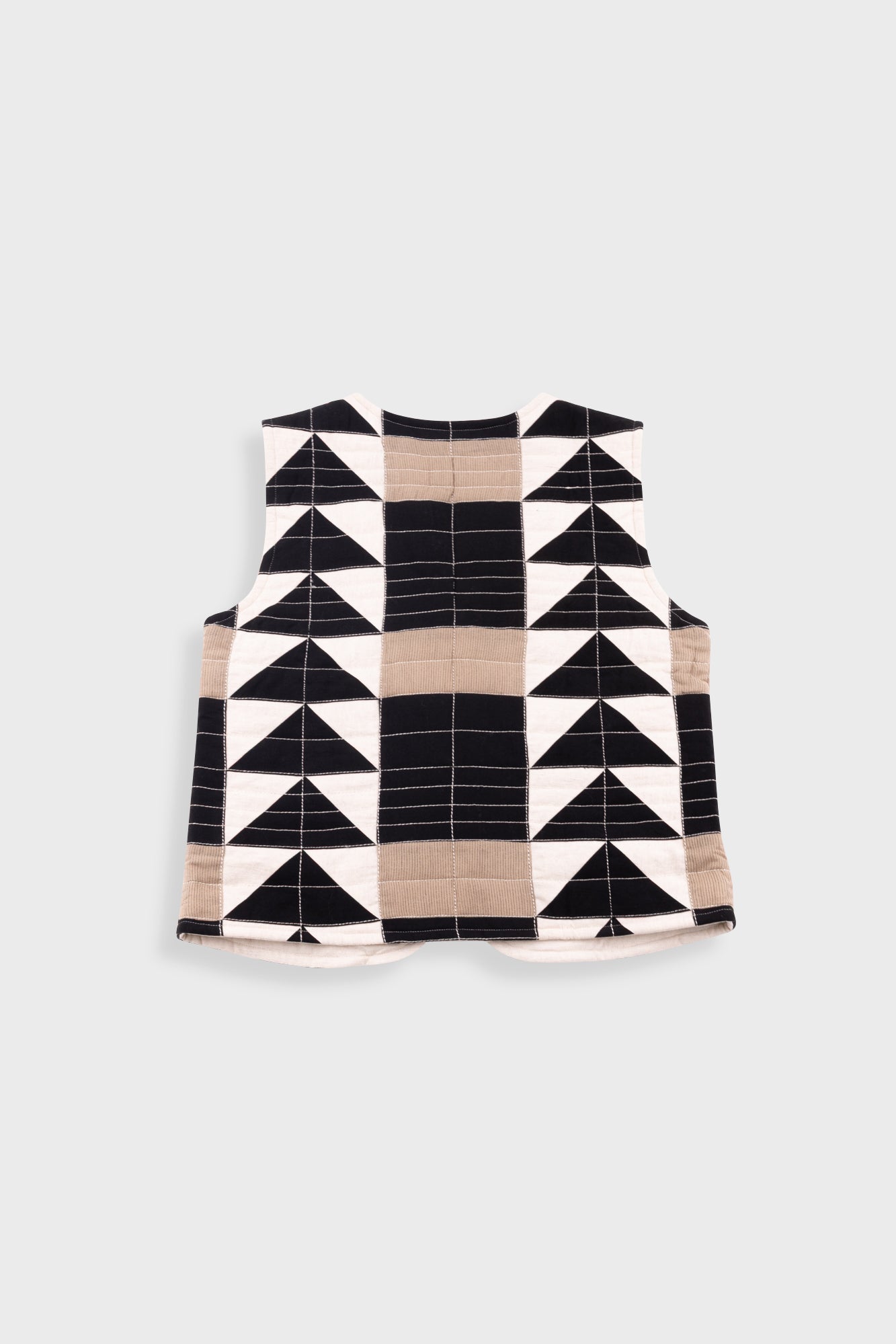 The Sib Vest is created in a hand patch-worked pattern using three key fabrics from the season in tones of black, taupe and off-white. This style is an easy layering piece that can be worn over first layers or over a jacket. The Sib Vest features a front tie and patch pockets. Fits true to size.