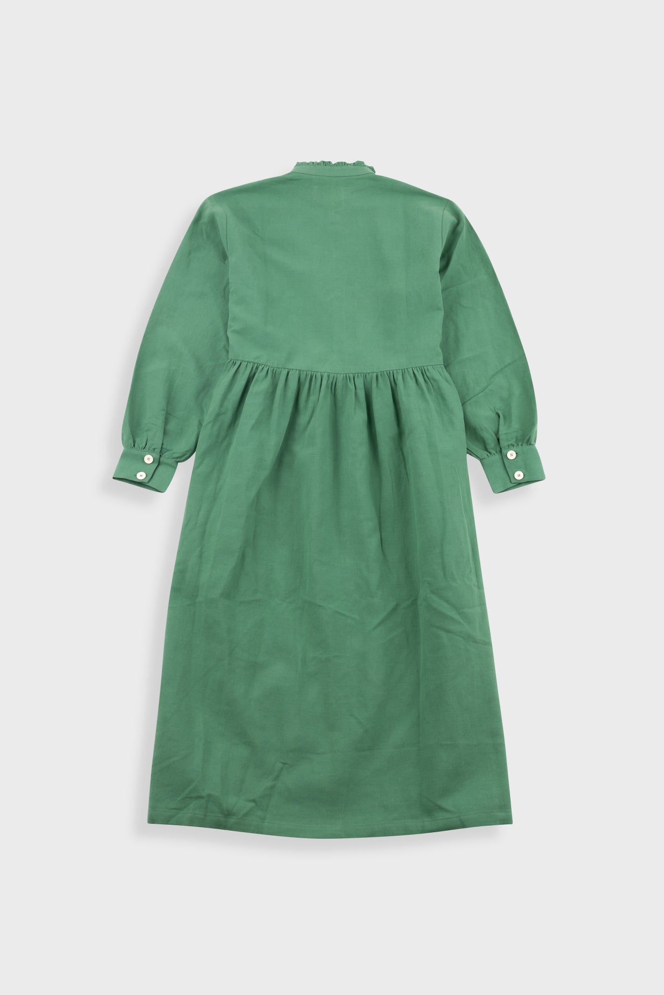 The Whistle Dress is made from a beautiful cotton with a subtle stripe within the weave this fabric has a lovely texture and feel. This style has a slightly oversized silhouette featuring a loose waist seam with gathers into a fuller skirt. The Whistle Dress also has a stand collar with delicate ruffle, button through front placket and concealed side pockets. This style is designed to be worn loose with an oversized silhouette so if a slimmer fit is preferred it can be sized down.