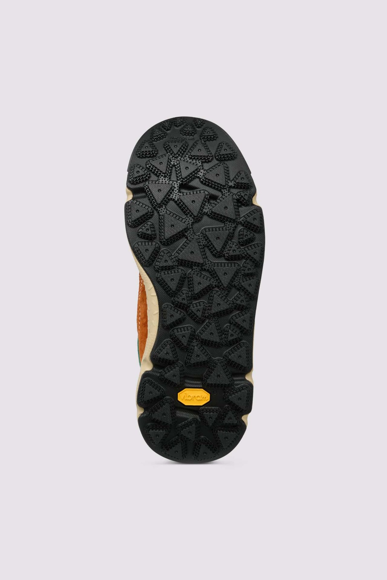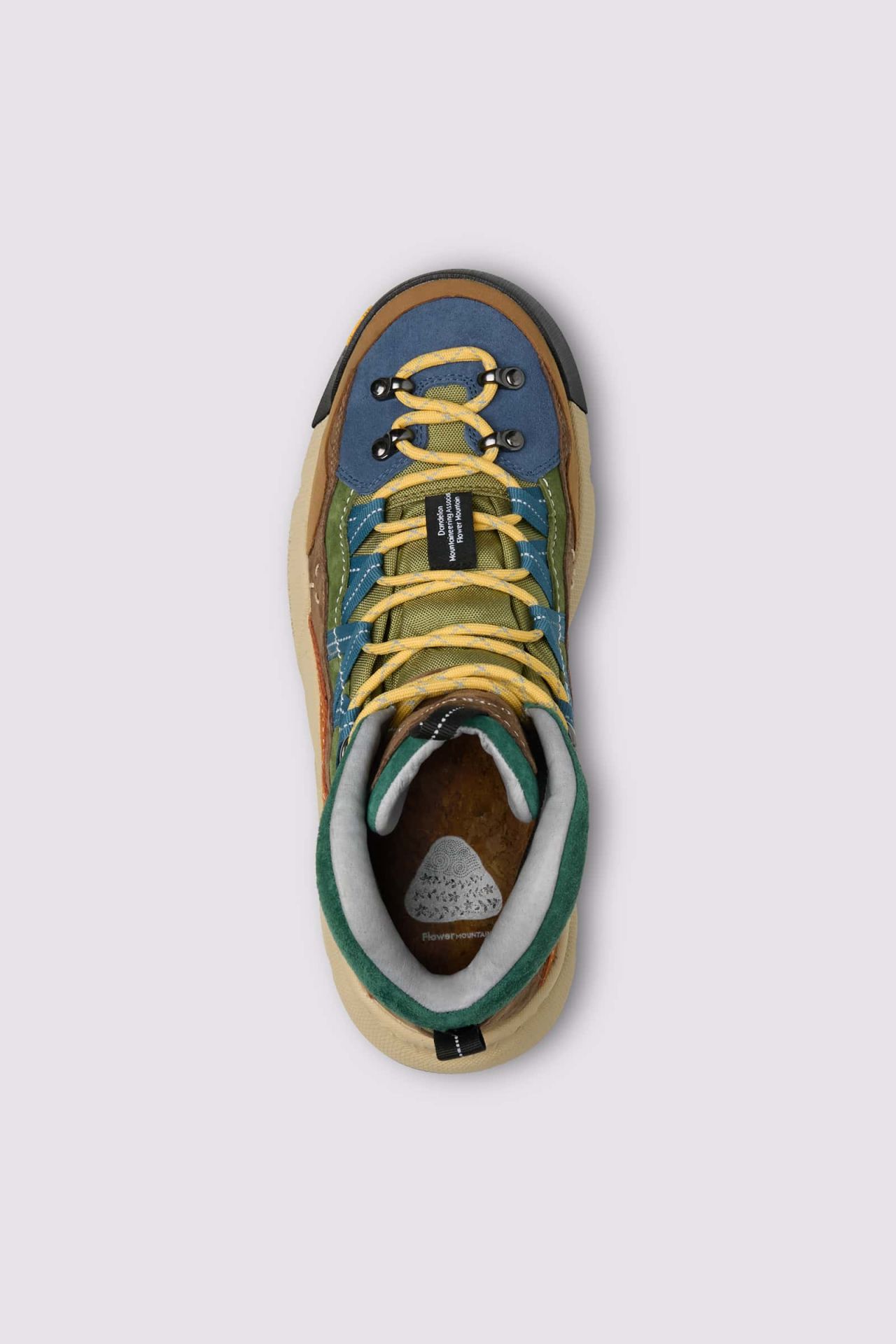 High-top sneakers with suede and leather technical fabric uppers. Trekking laces and closure with metal eyelets. Removable insole in natural cork, Vibram rubber sole.