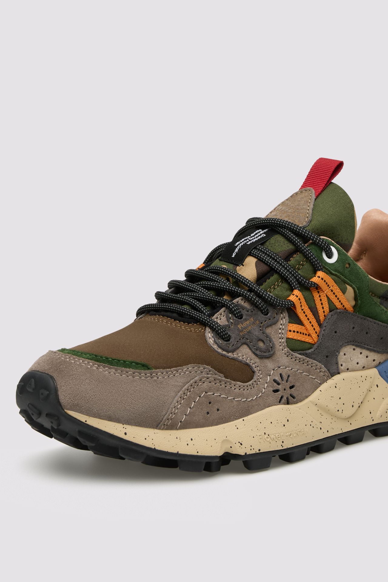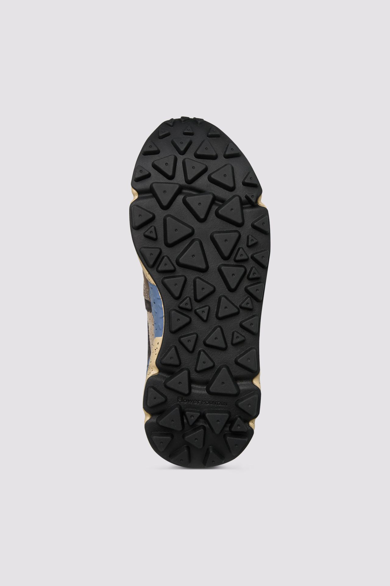 Sneakers in technical fabric and multicoloured suede. Closure with two-tone trekking laces and customised eyelets. Fabric and leather lining, with natural antibacterial cork insole. Ultra-light rubber sole with toothed tread.