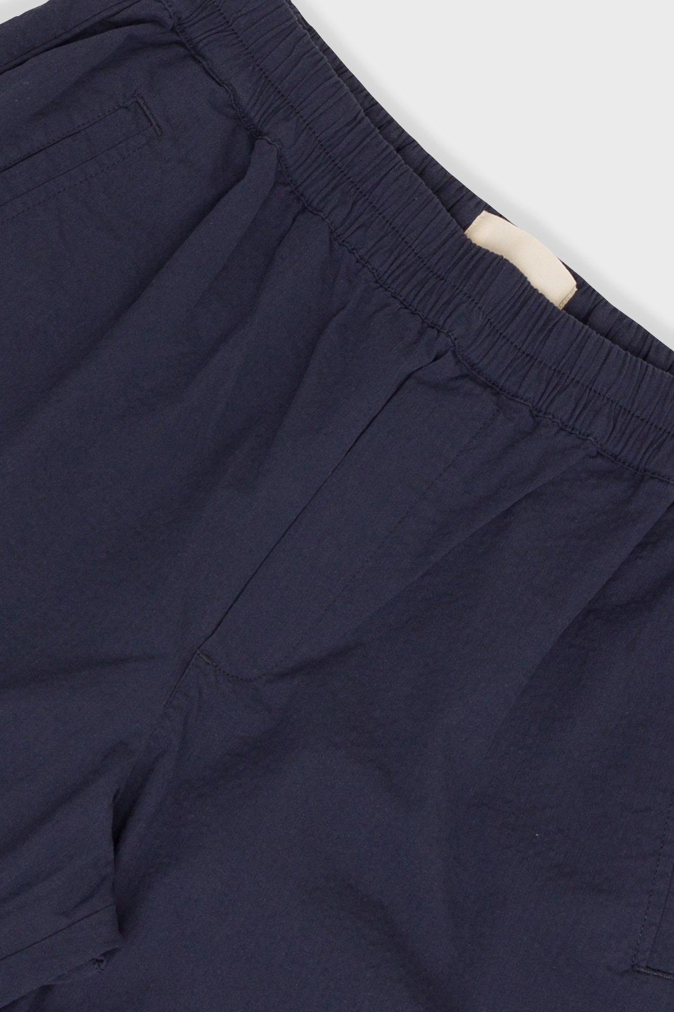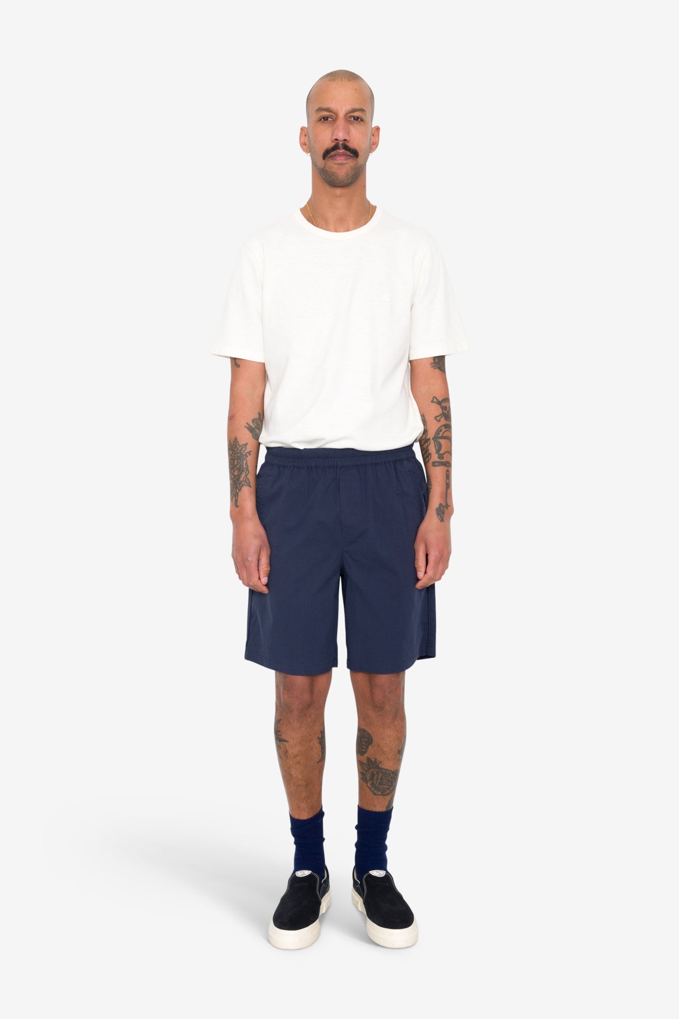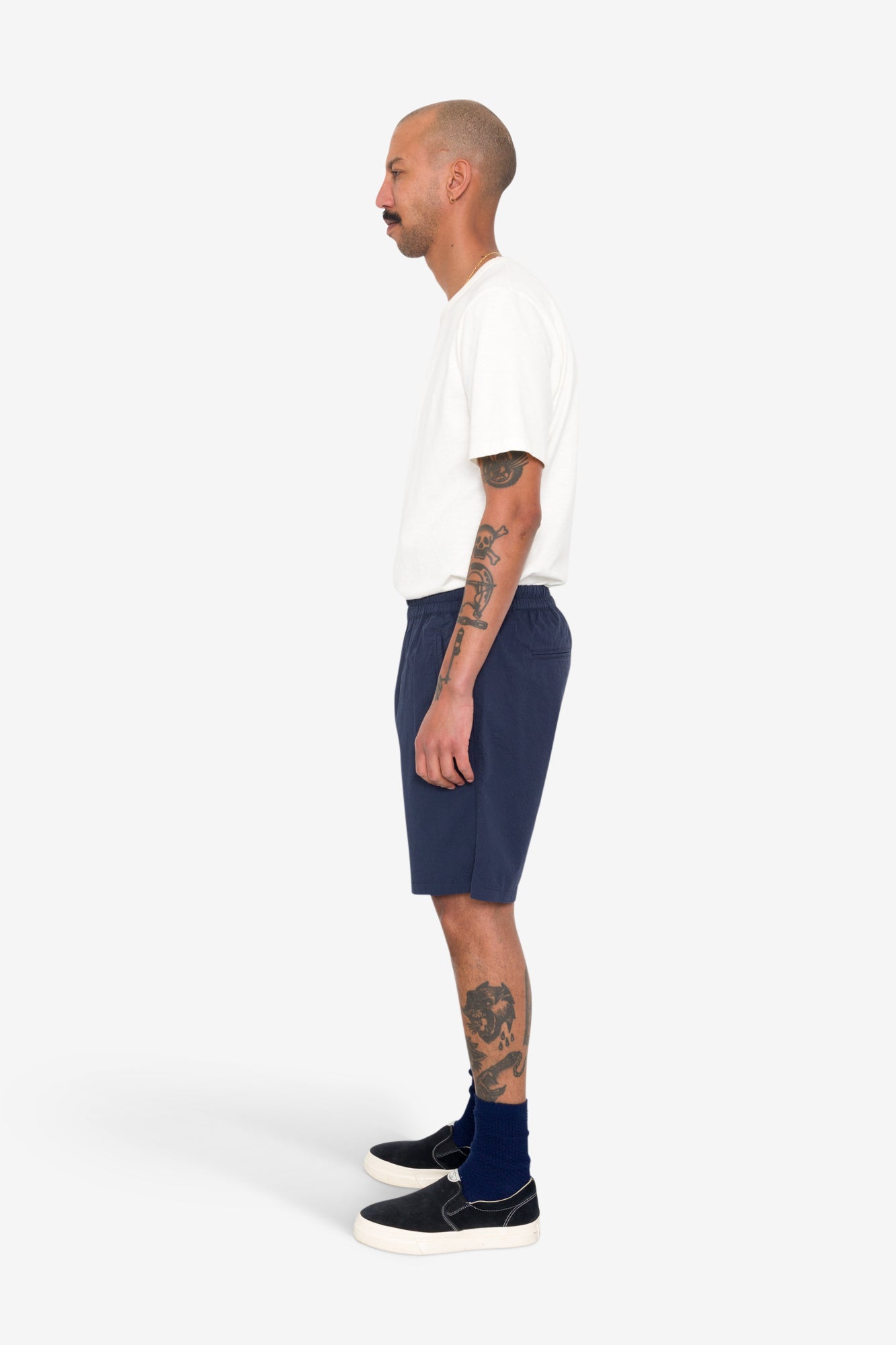 - Regular short block Elasticated waistband in self fabric, with drawcords finishing internally through embroidered eyelets.