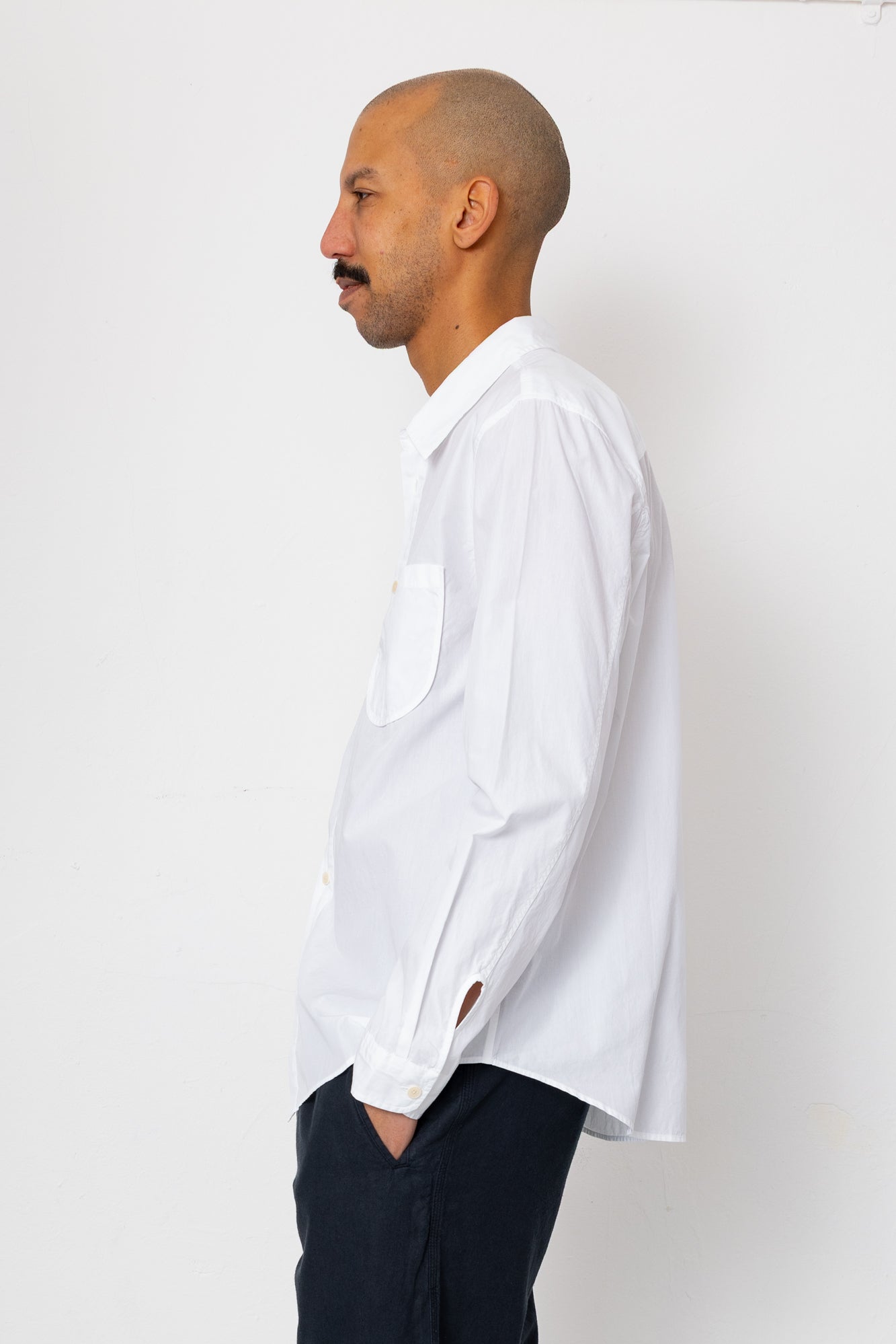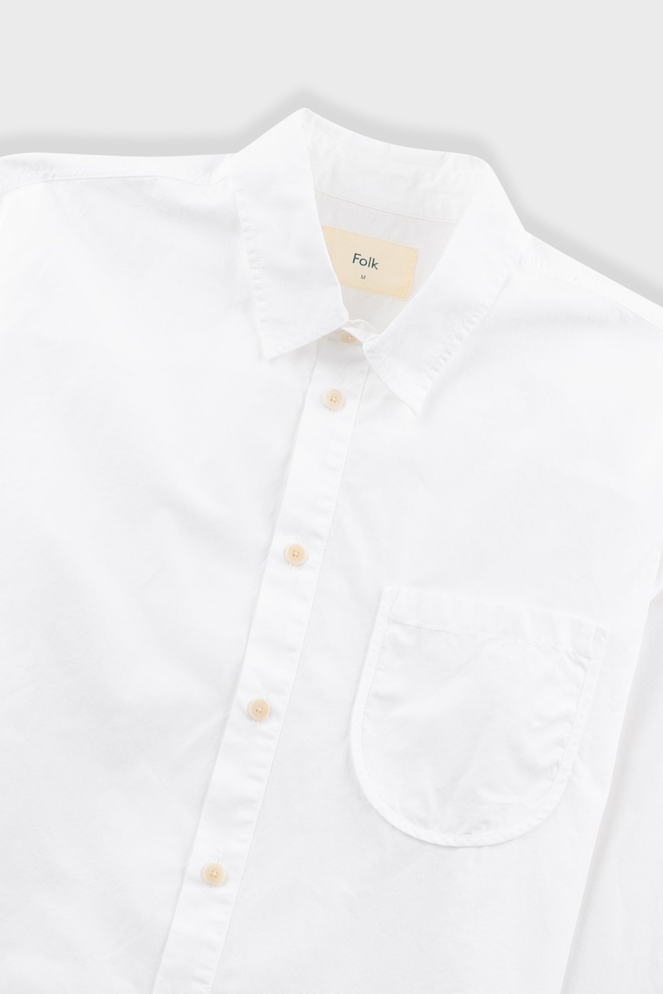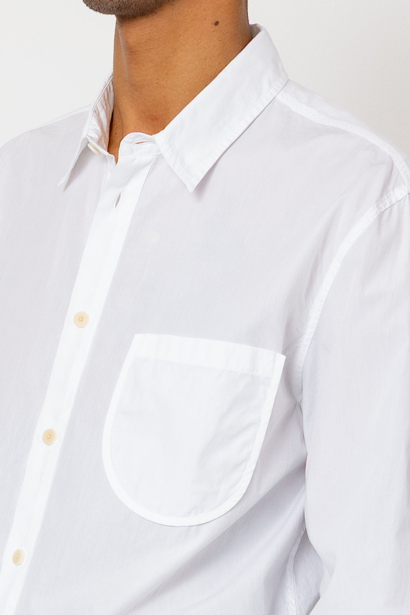- Patch pocket at chest with curved base & bound edge.