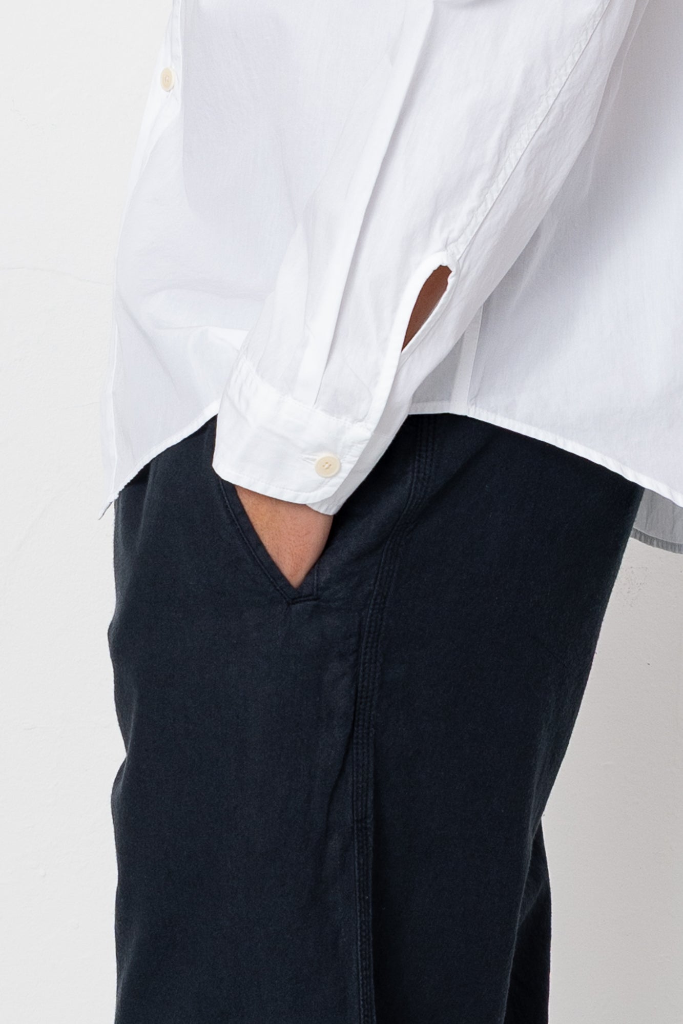 - Curved back yoke seam.