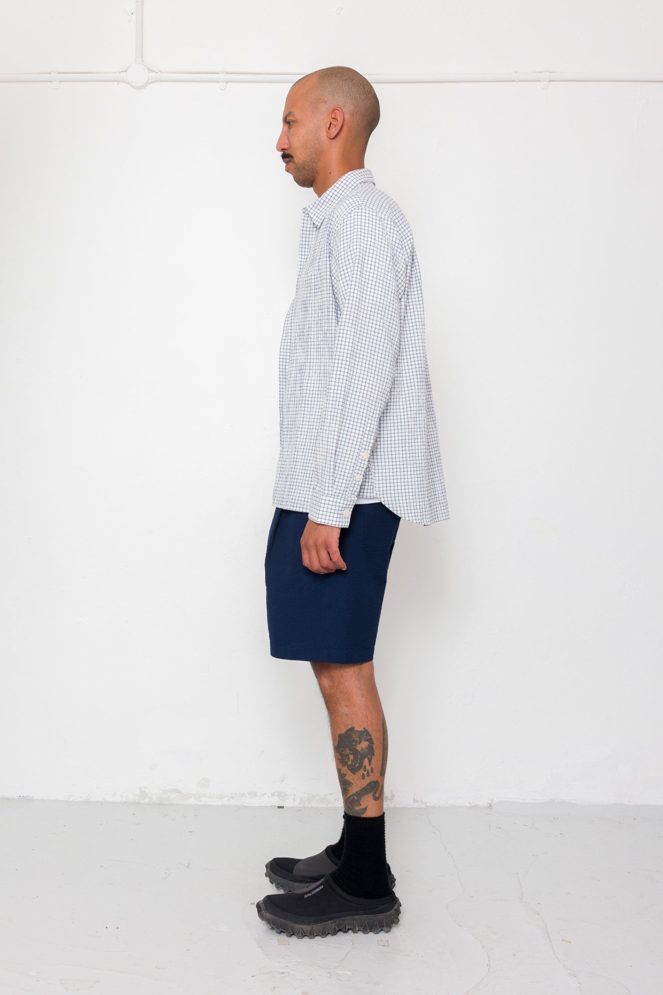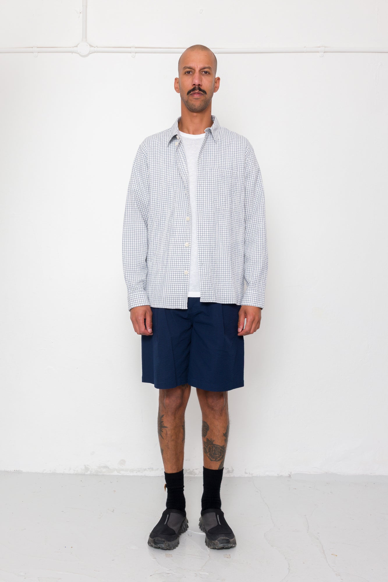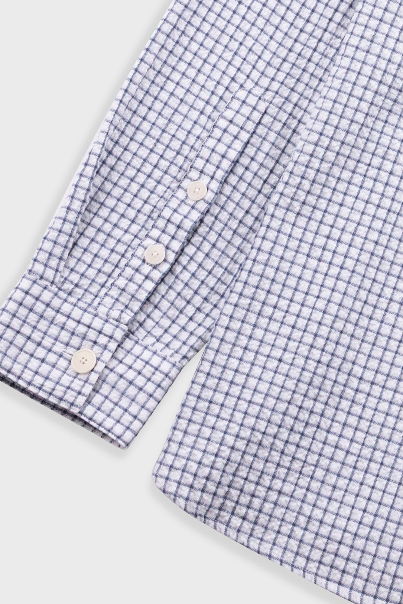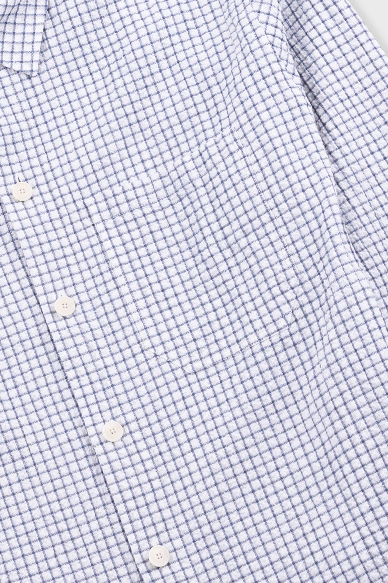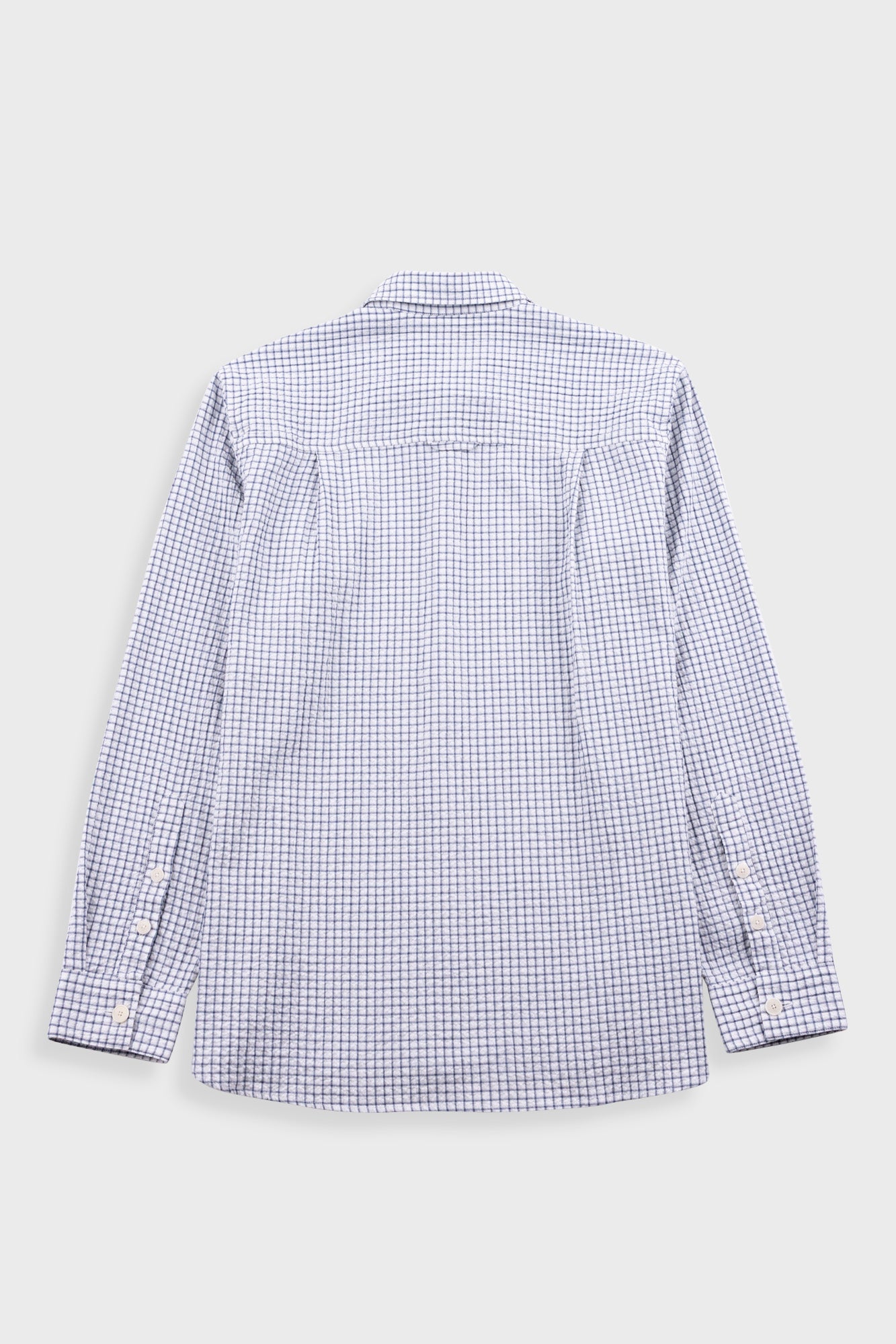 A new casual shirt with a loose, boxy fit body and oversized details to complement the larger shape. It has been constructed in a lightweight cotton check fabric with crinkly surface and soft handfeel.