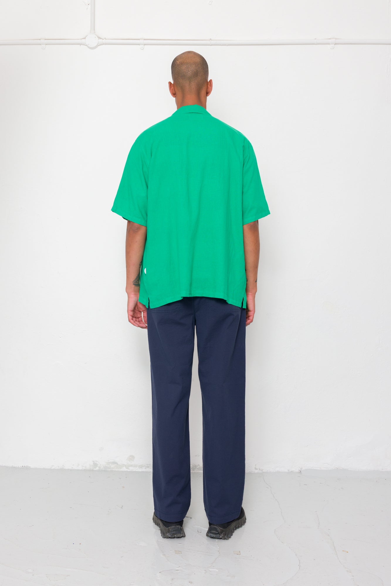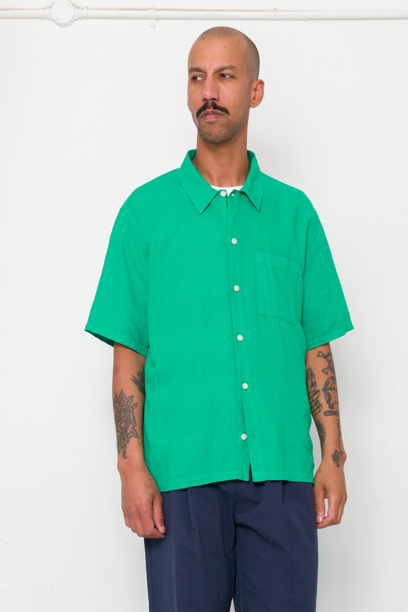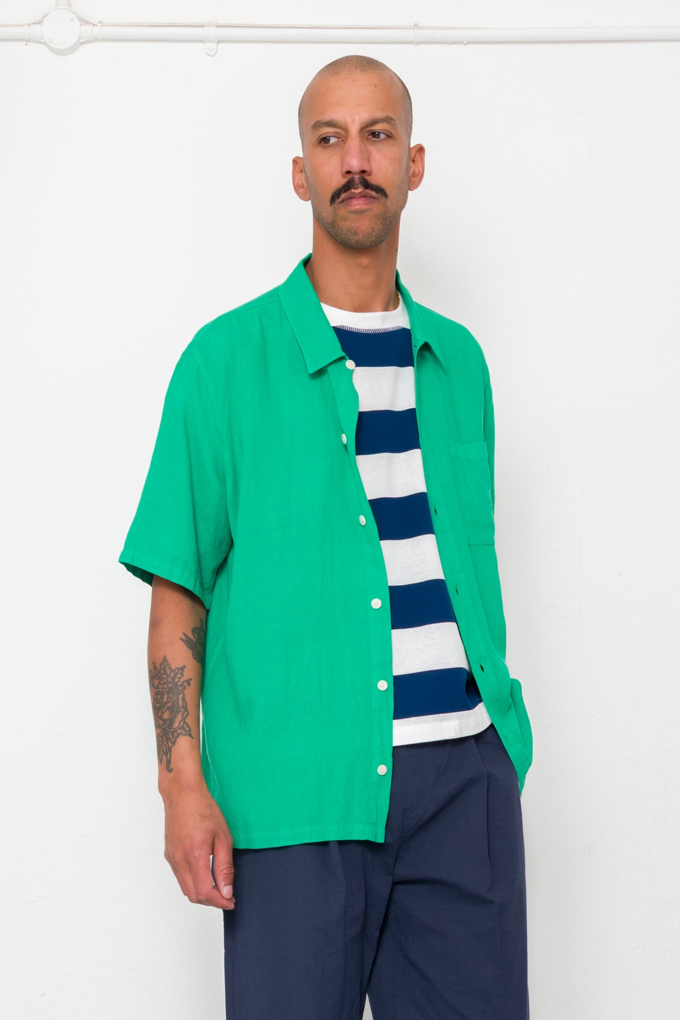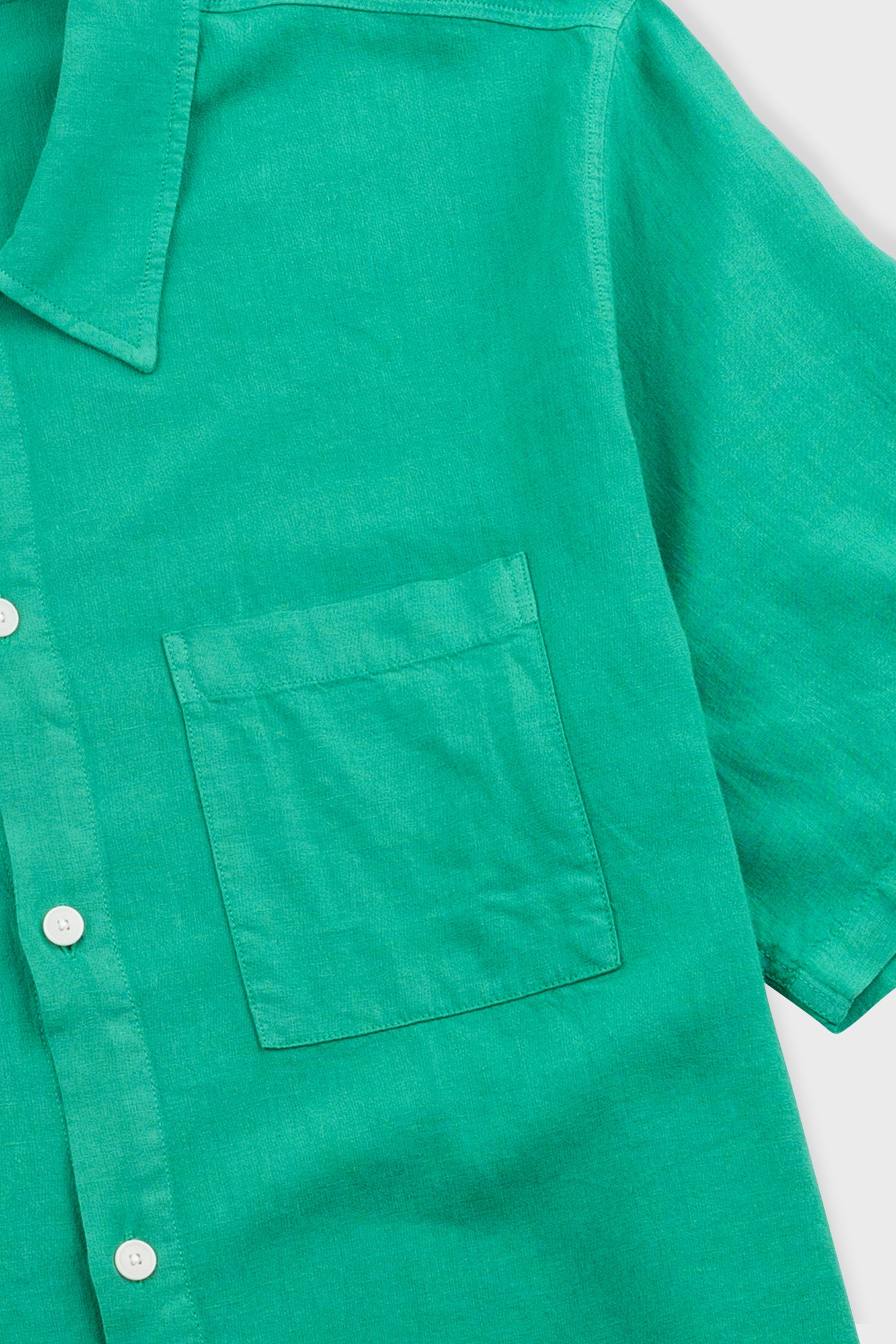 A relaxed fitting short sleeve shirt, constructed in a lightweight linen viscose fabric with soft handfeel and has been garment dyed.
