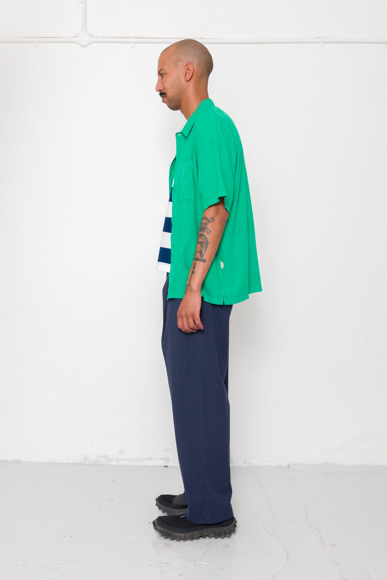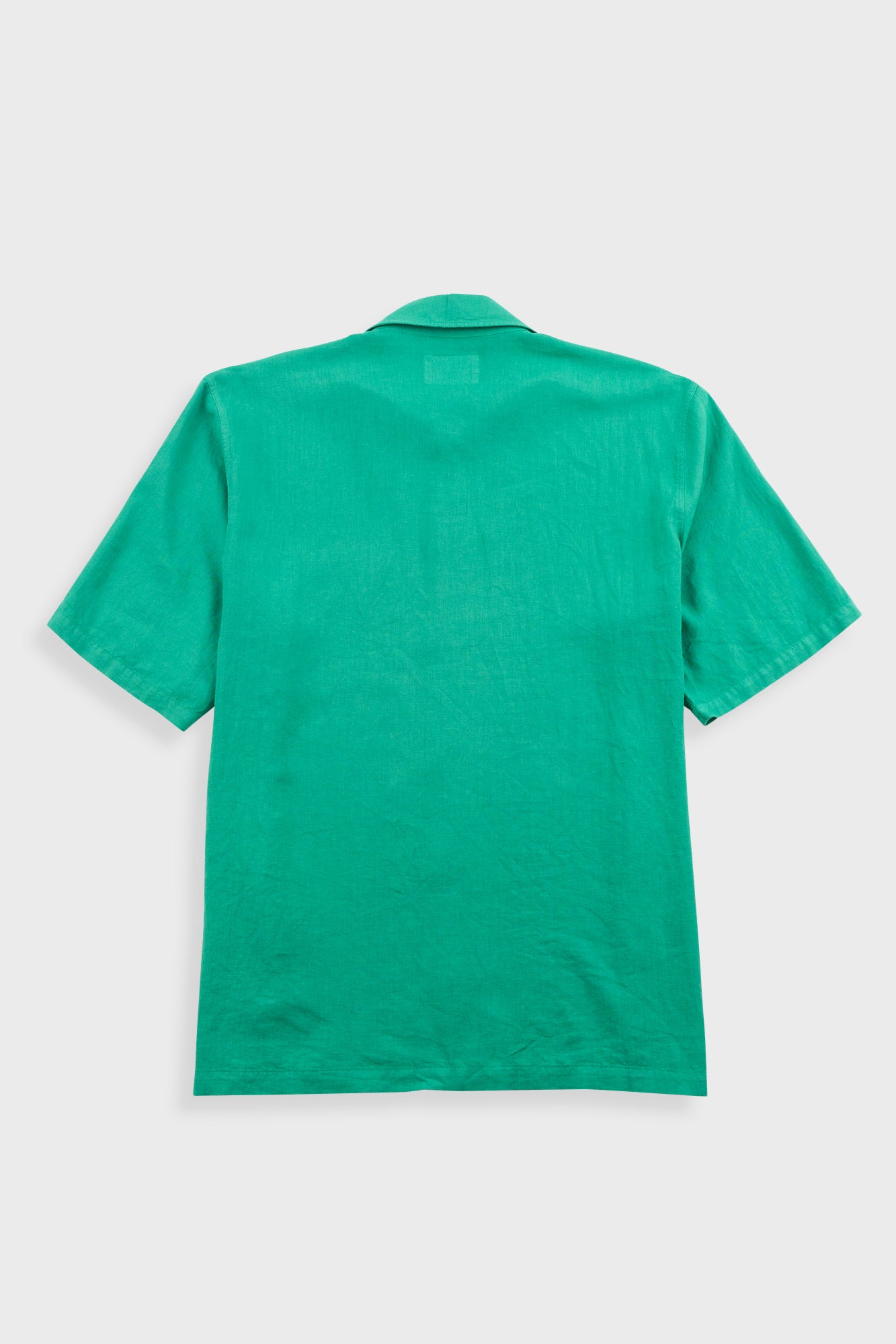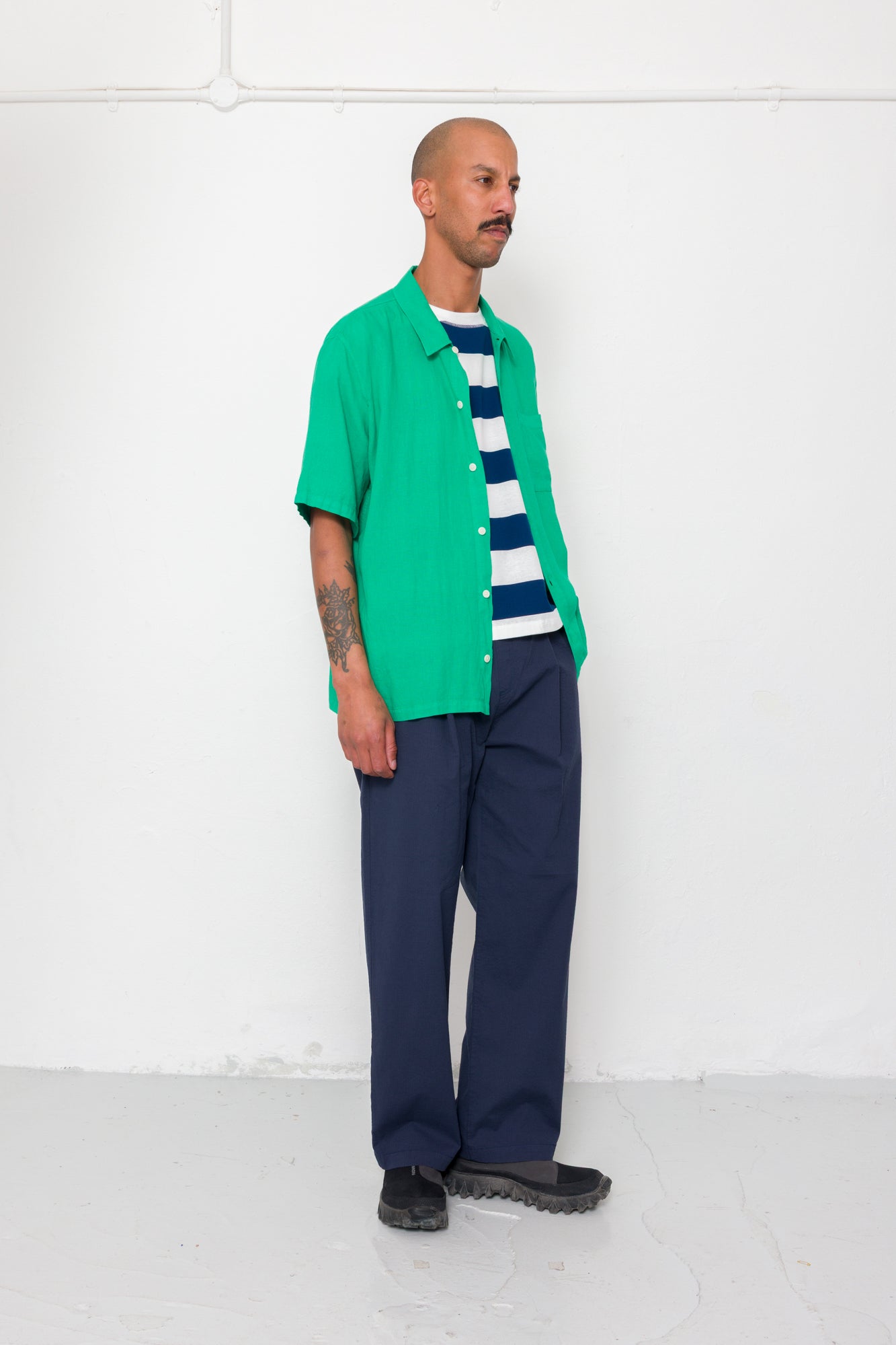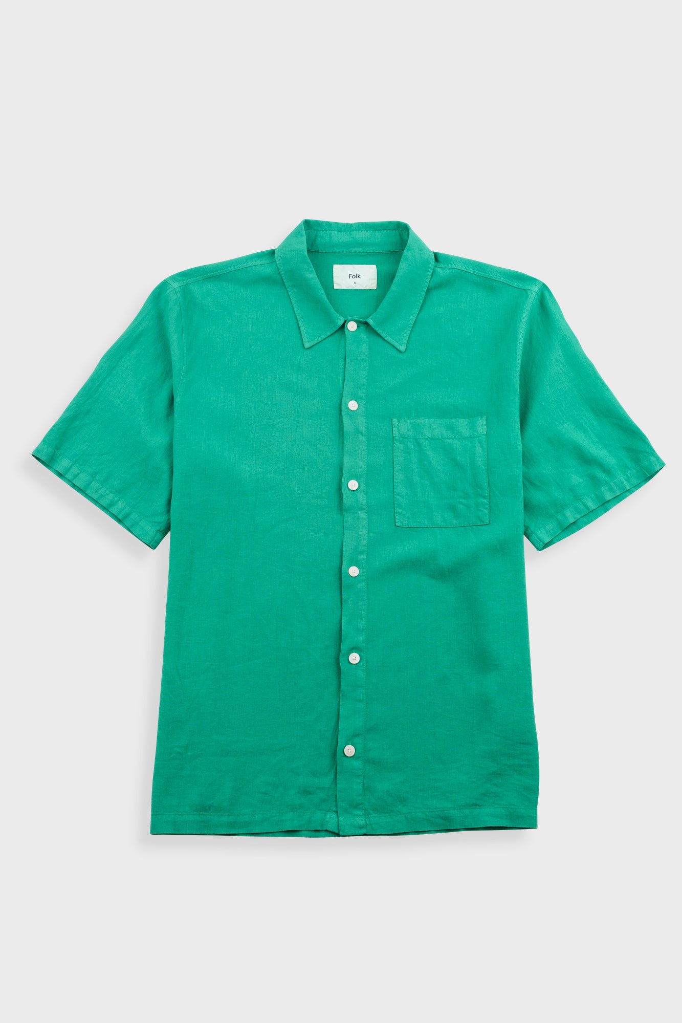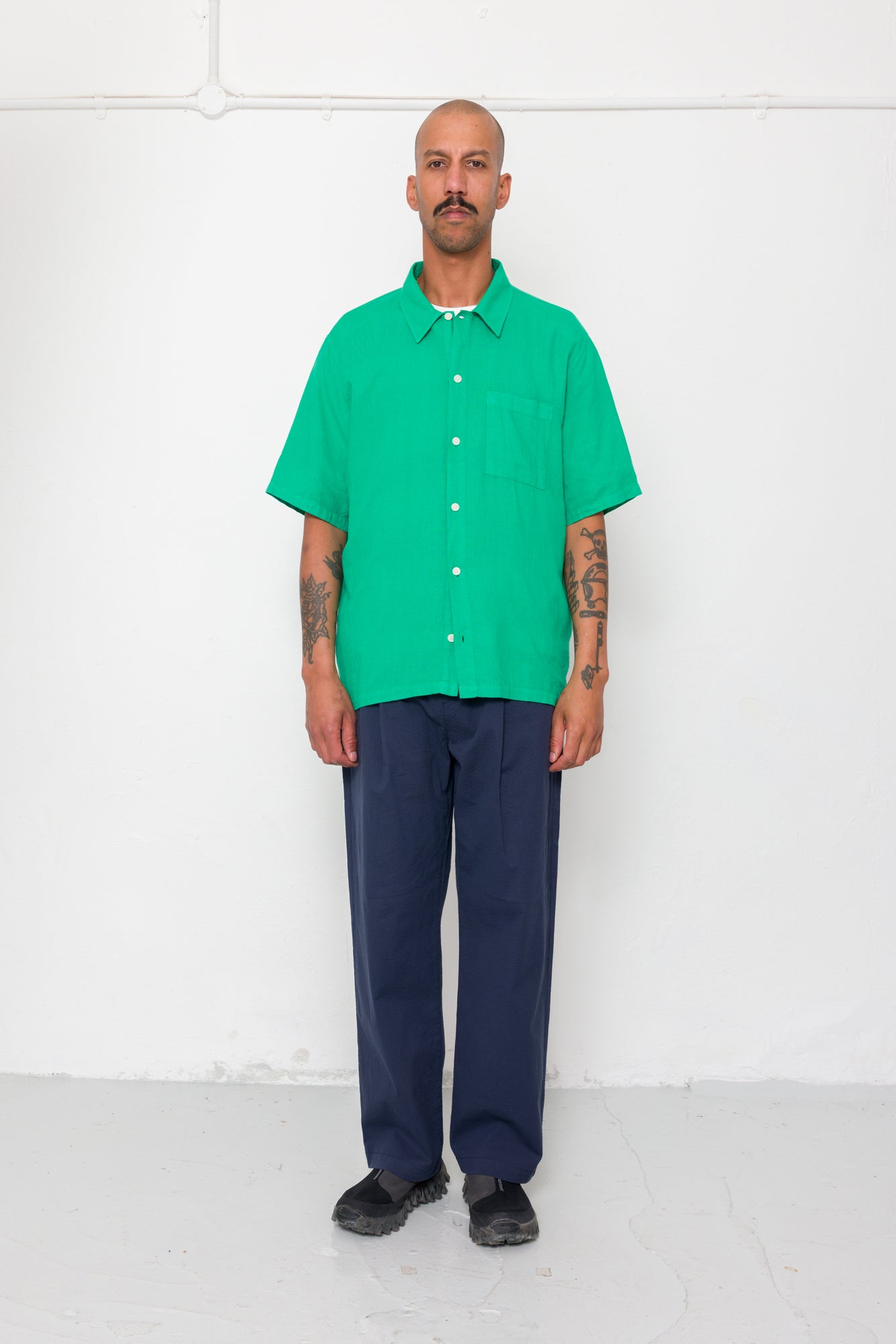 A relaxed fitting short sleeve shirt, constructed in a lightweight linen viscose fabric with soft handfeel and has been garment dyed.
