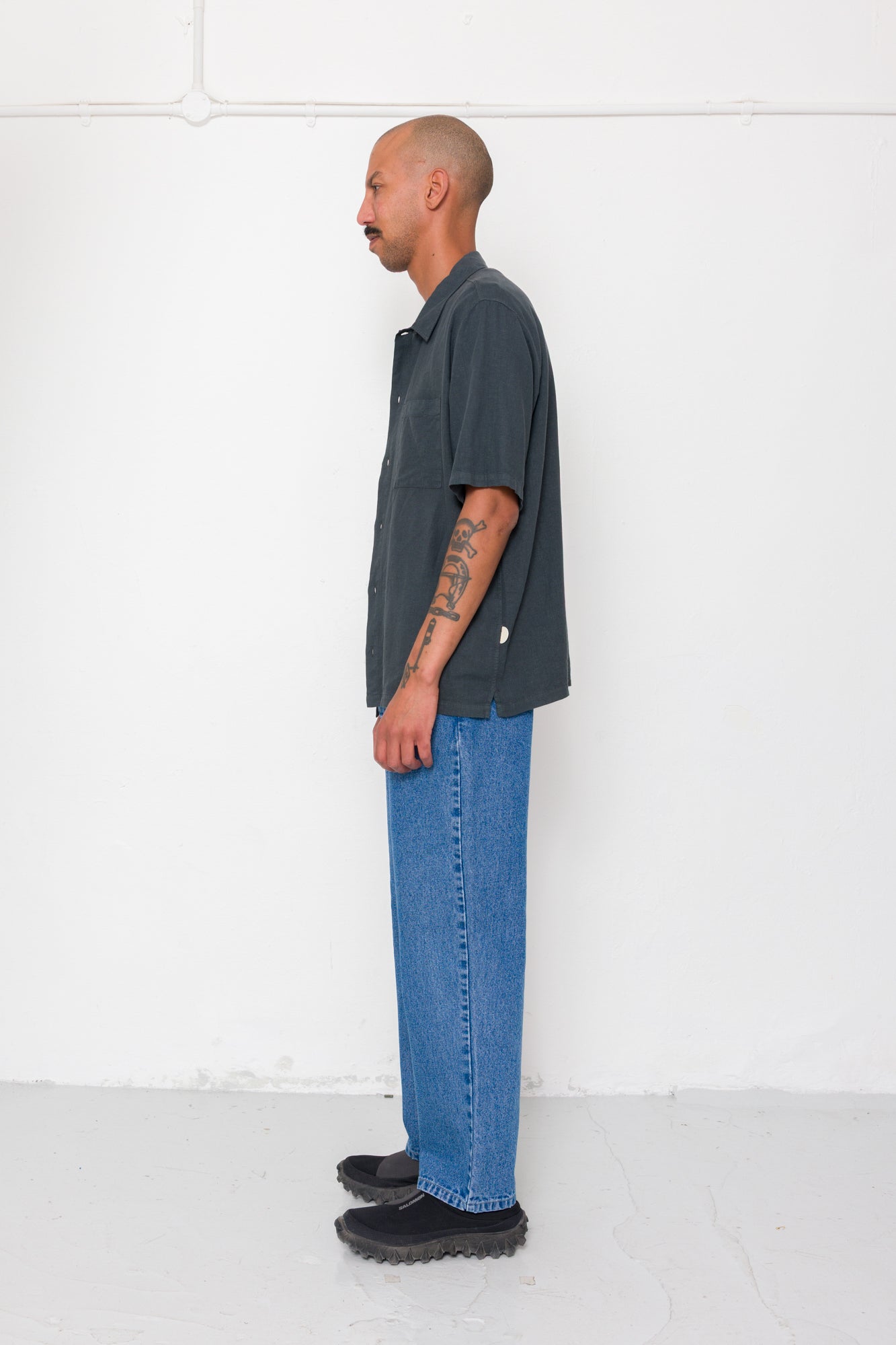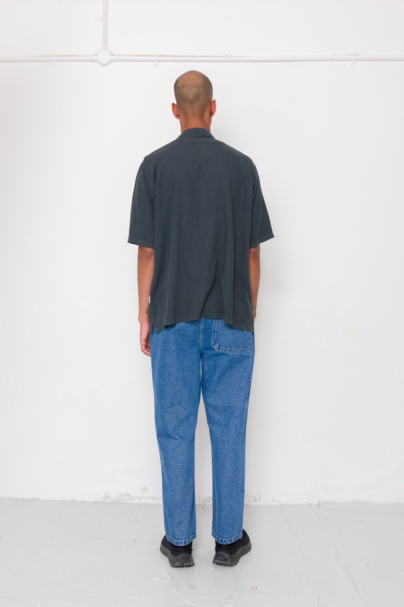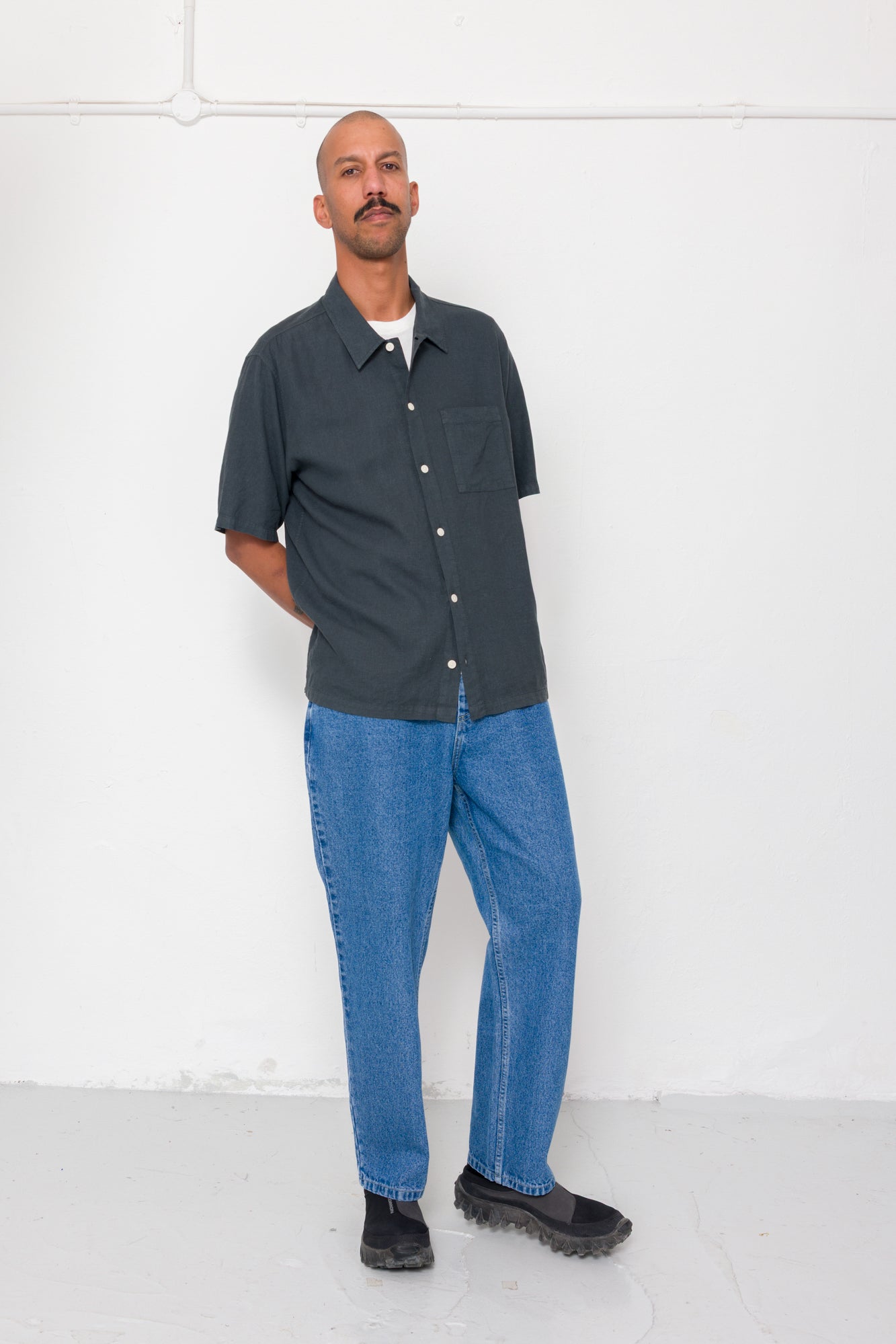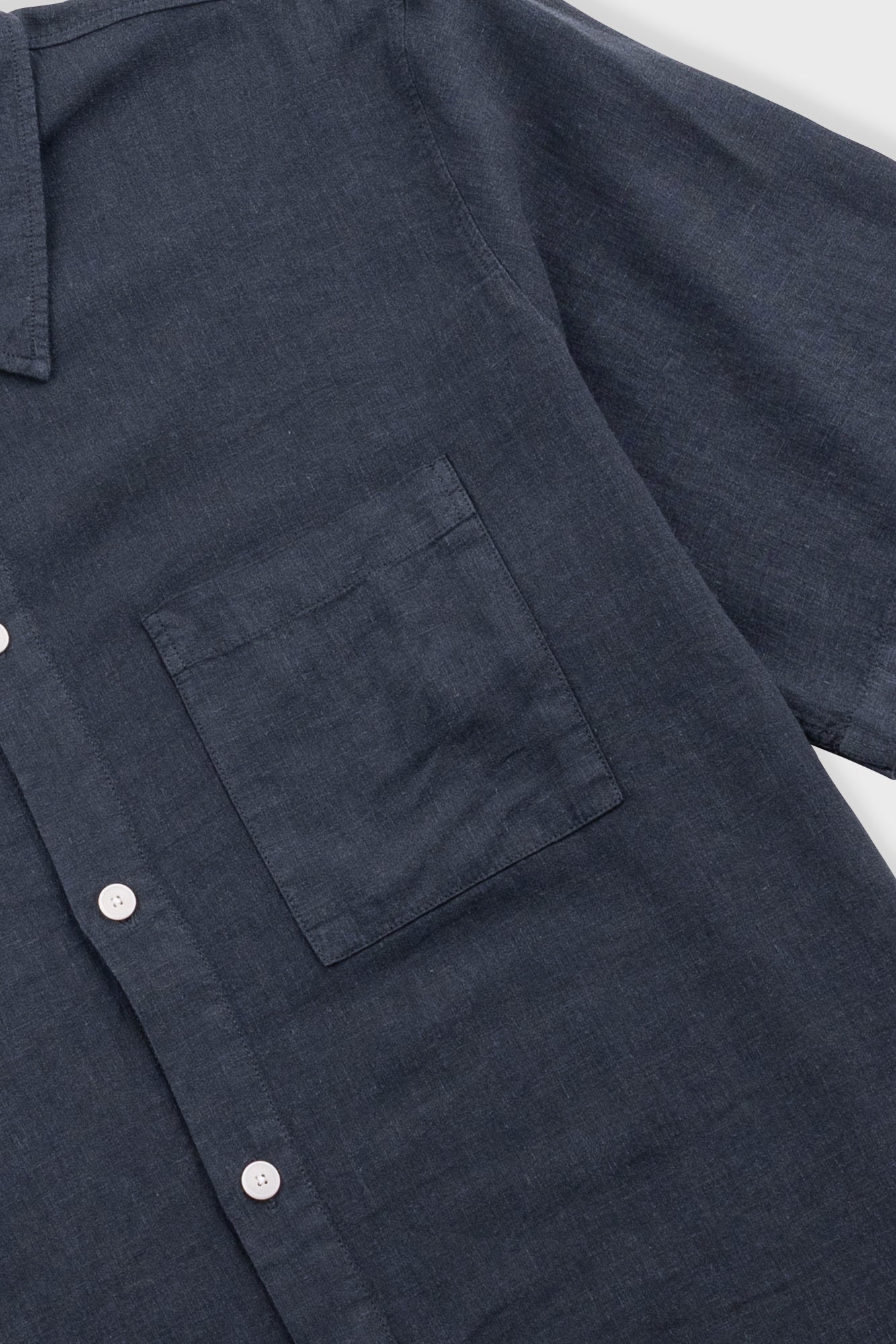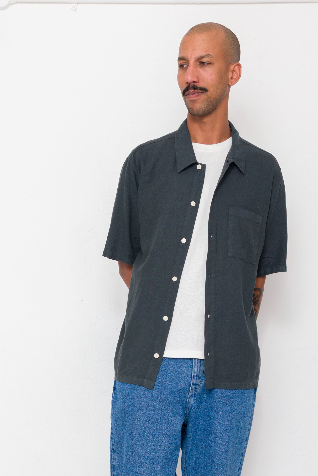 A relaxed fitting short sleeve shirt, constructed in a lightweight linen viscose fabric with soft handfeel and then garment dyed.