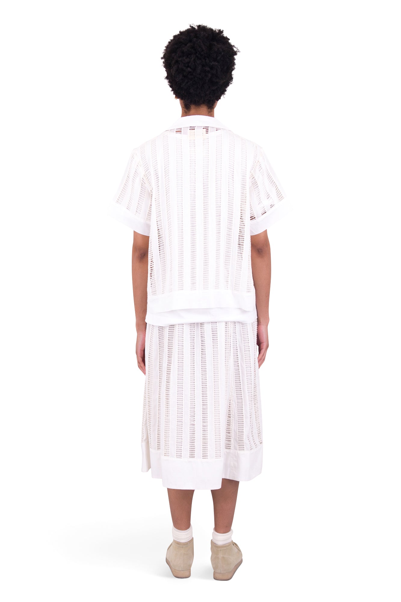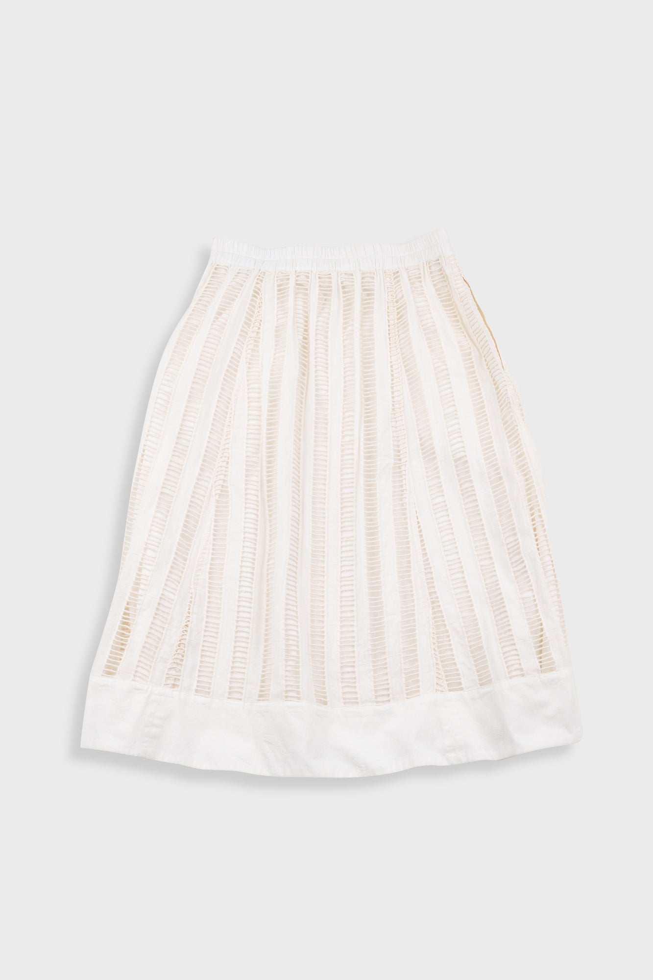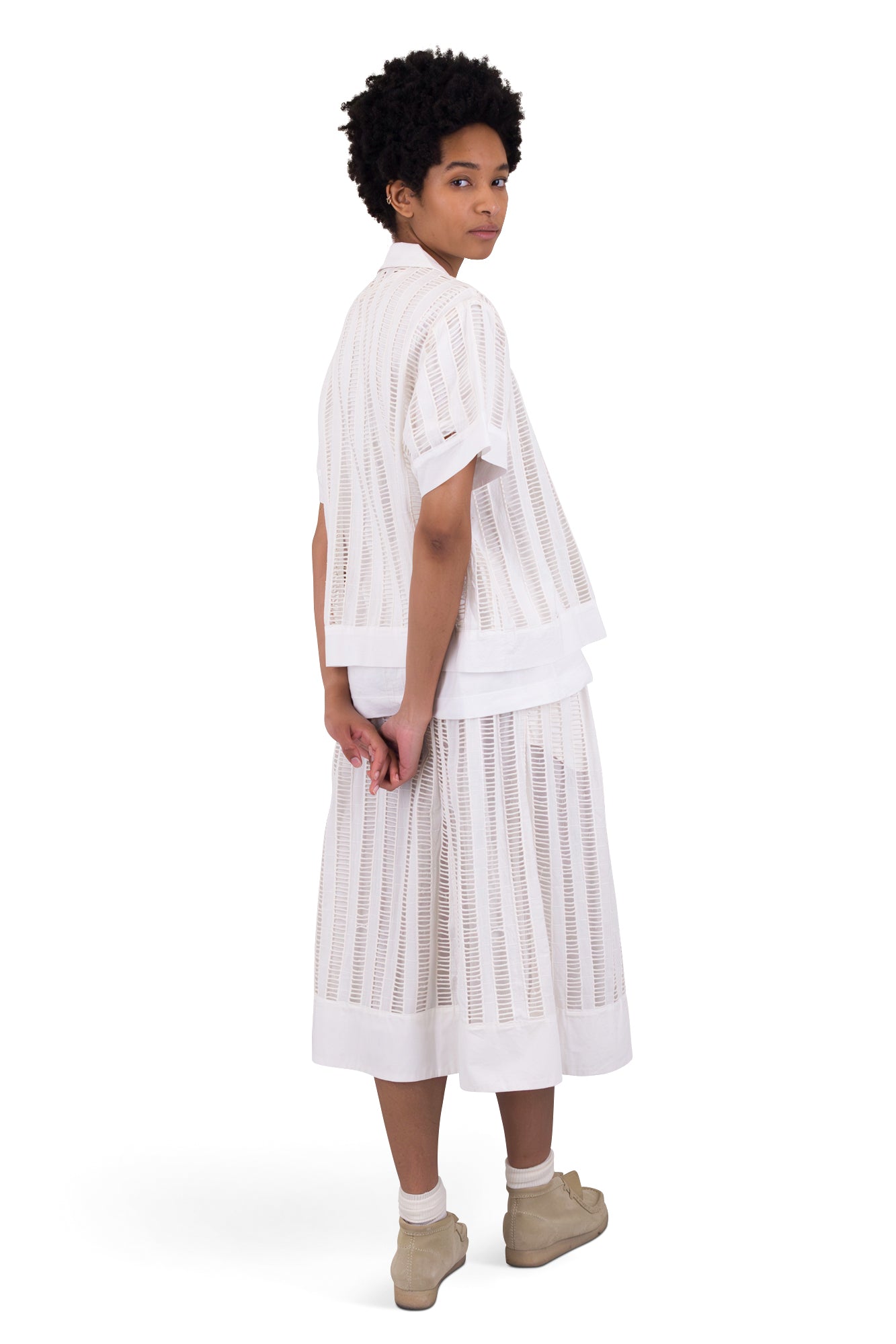 - Light cotton fabric with stripes of ladder emrboidery / cutouts to give texture and interest to the fabric.