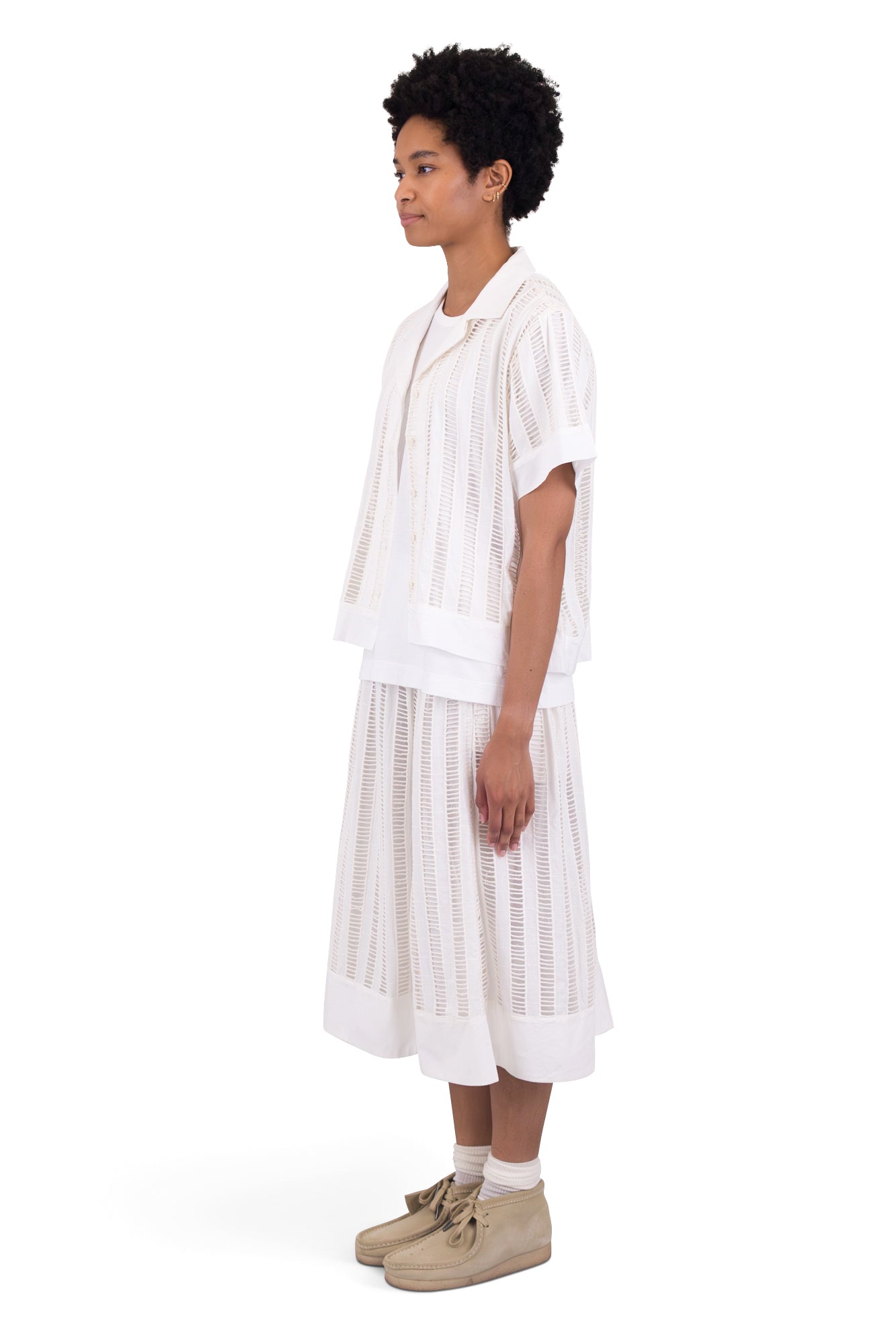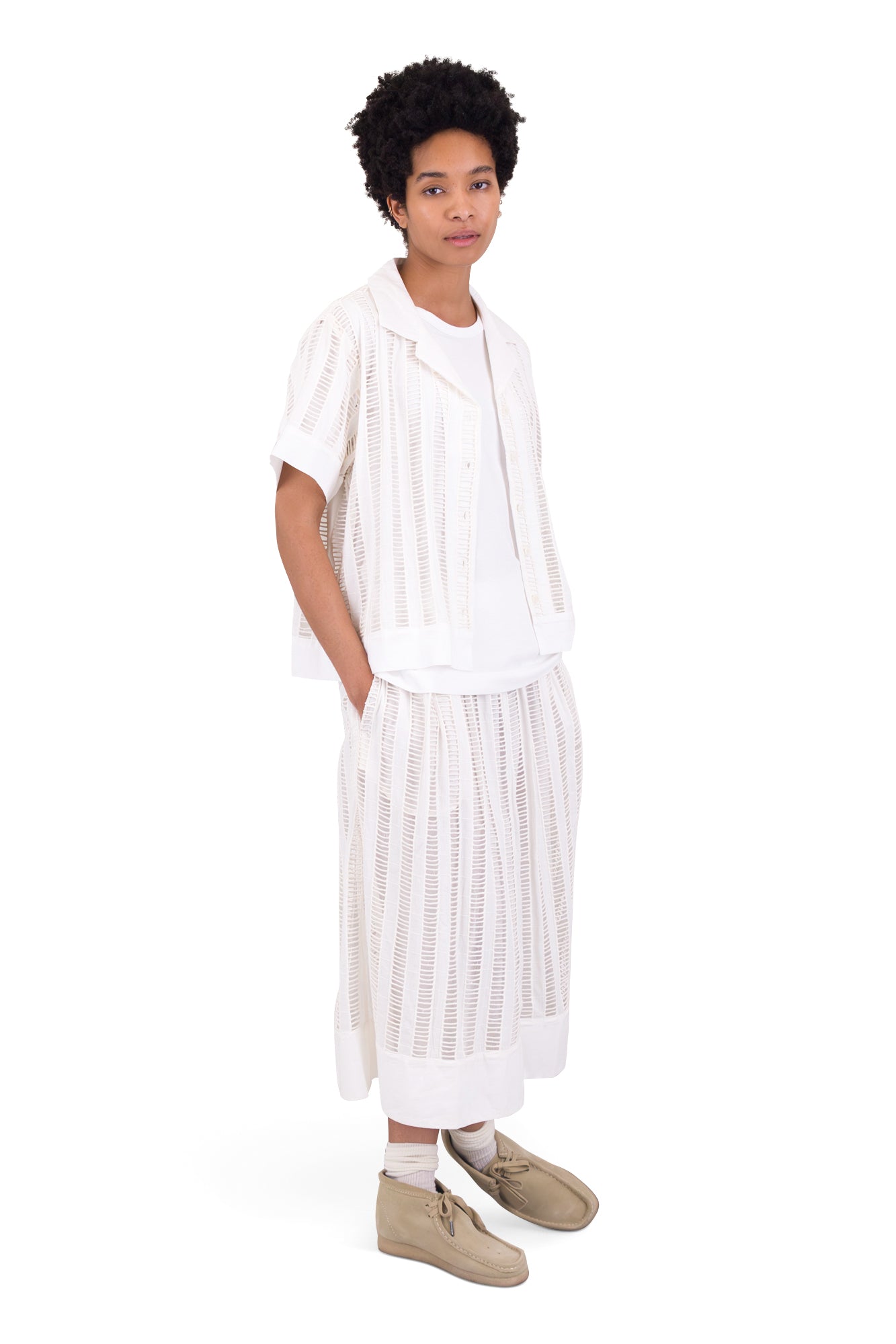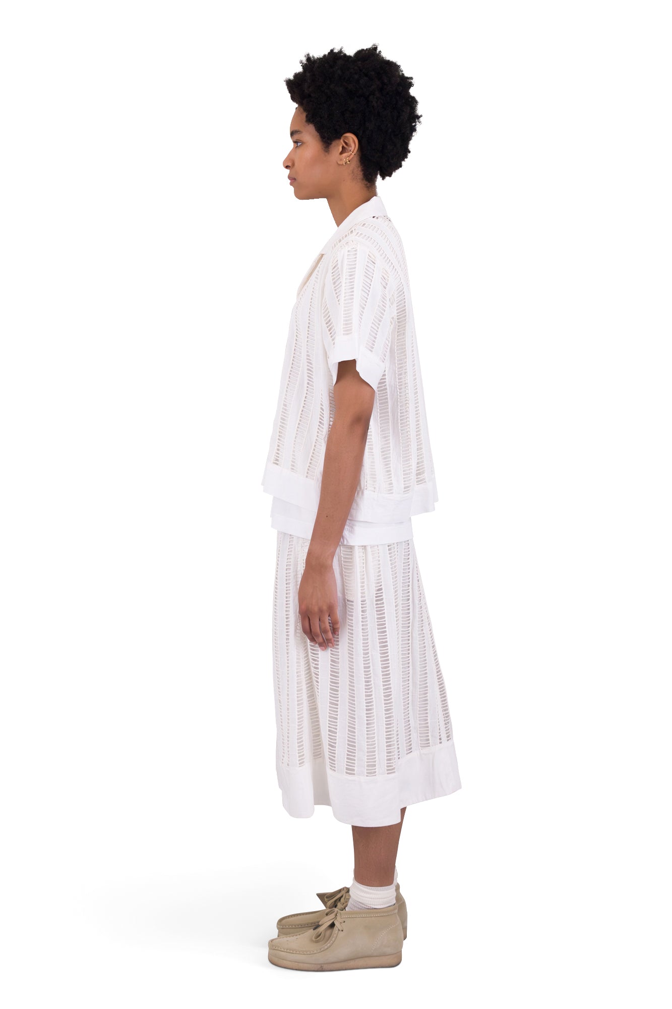 - Light cotton fabric with stripes of ladder emrboidery / cutouts to give texture and interest to the fabric.