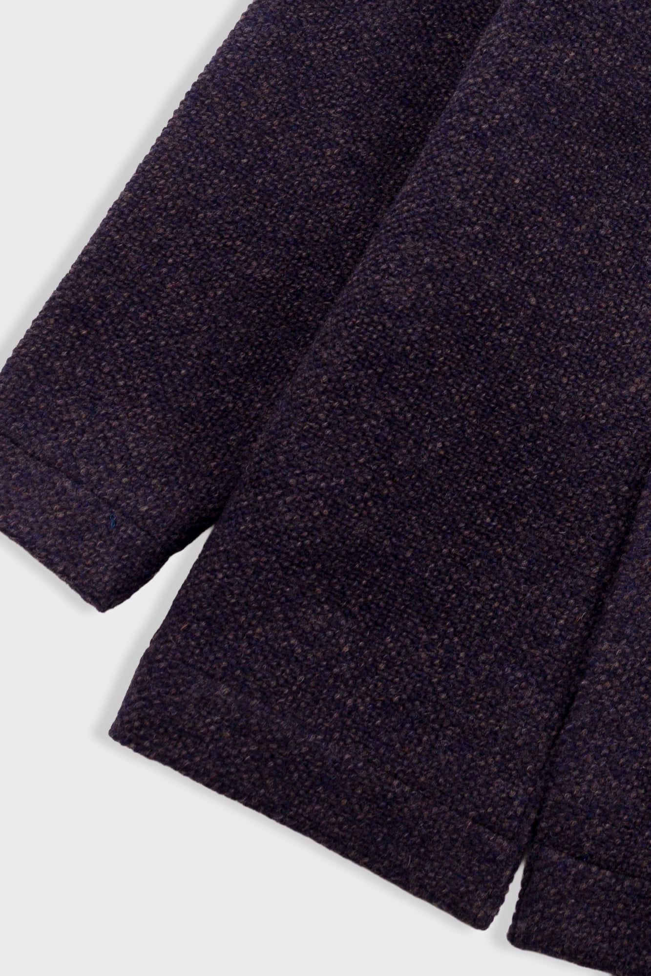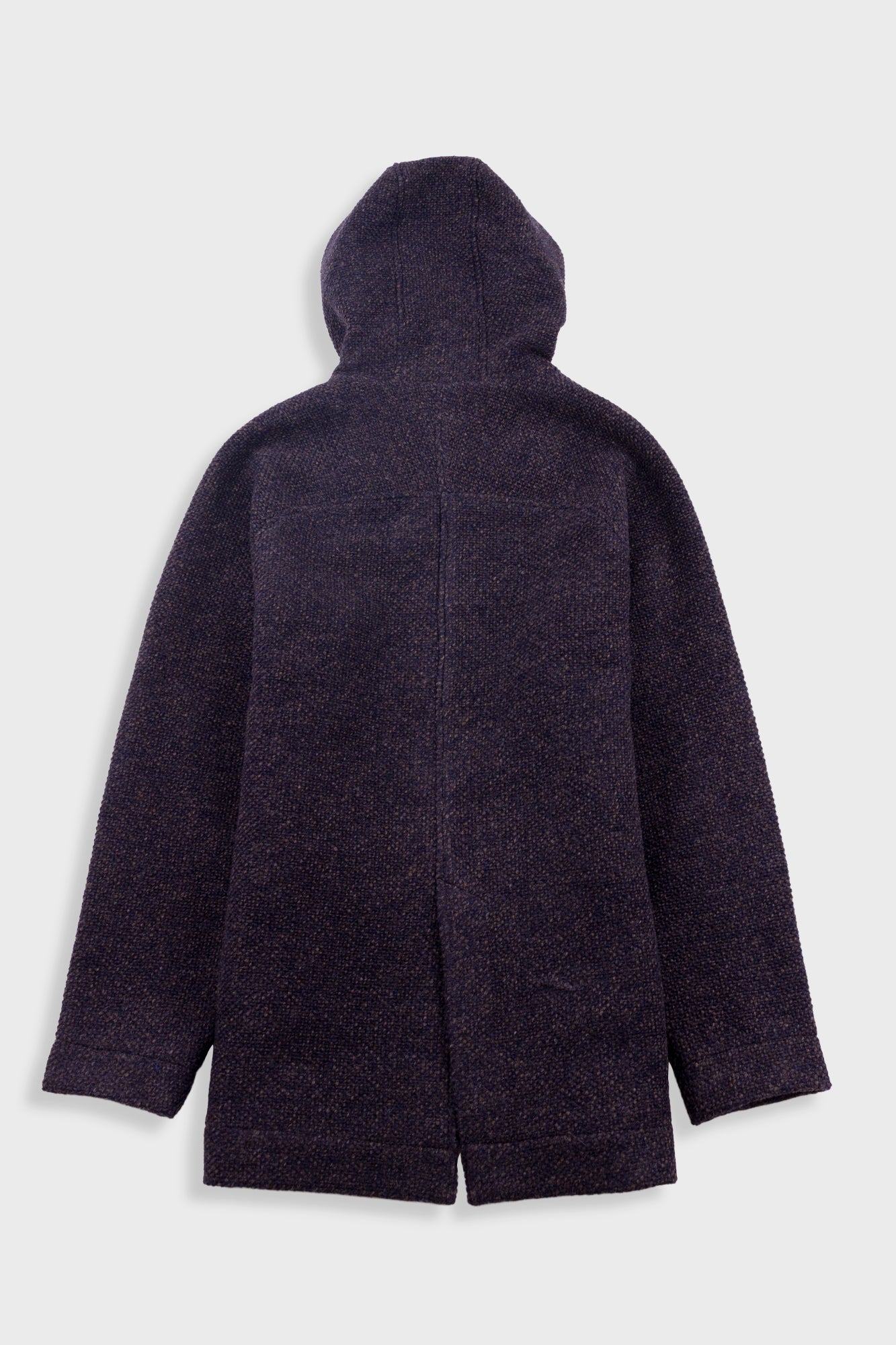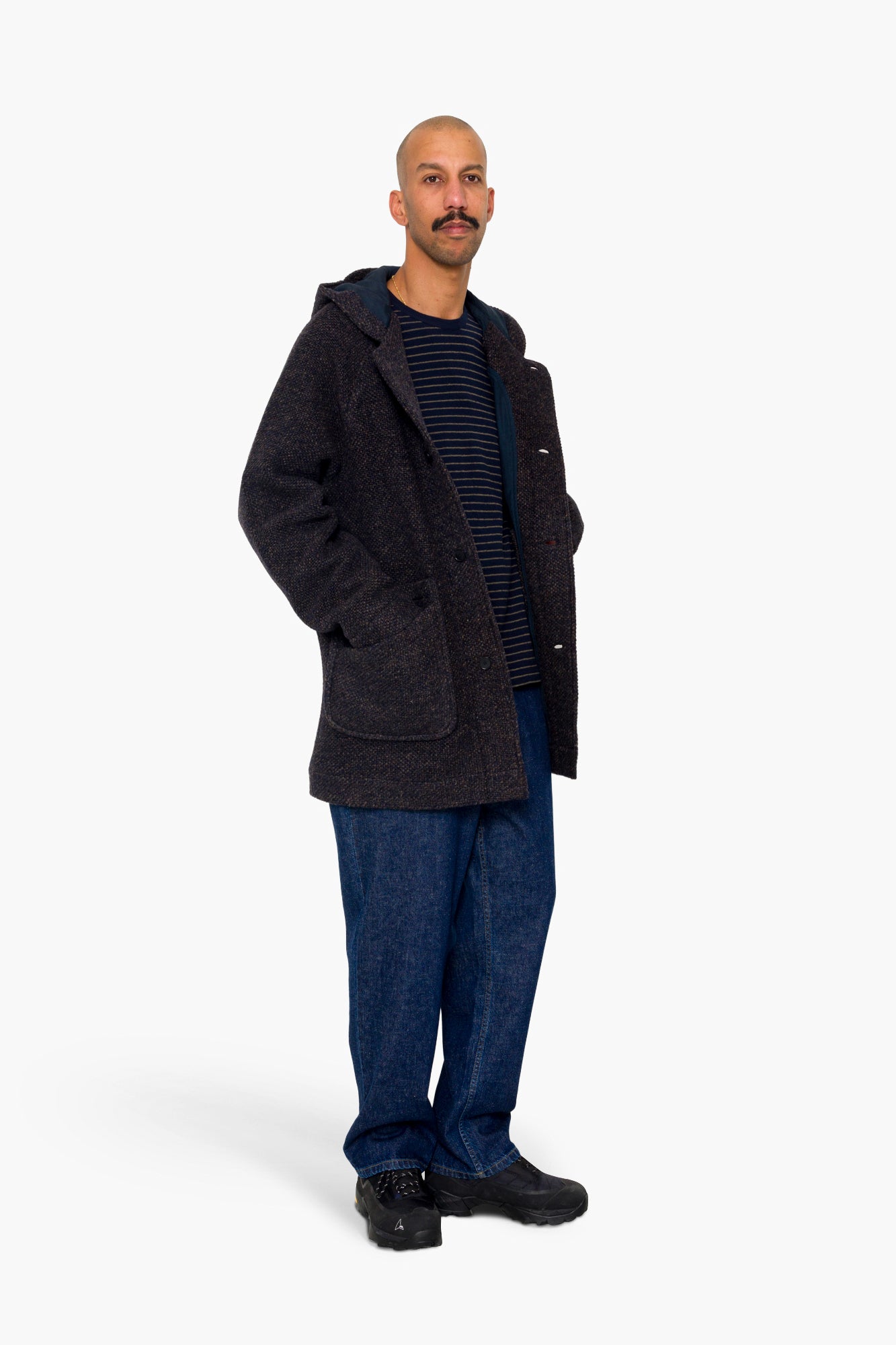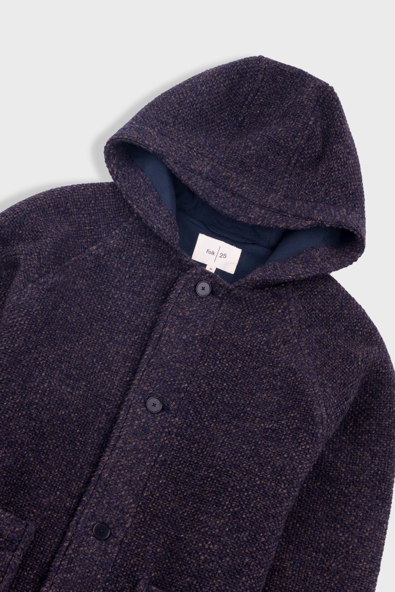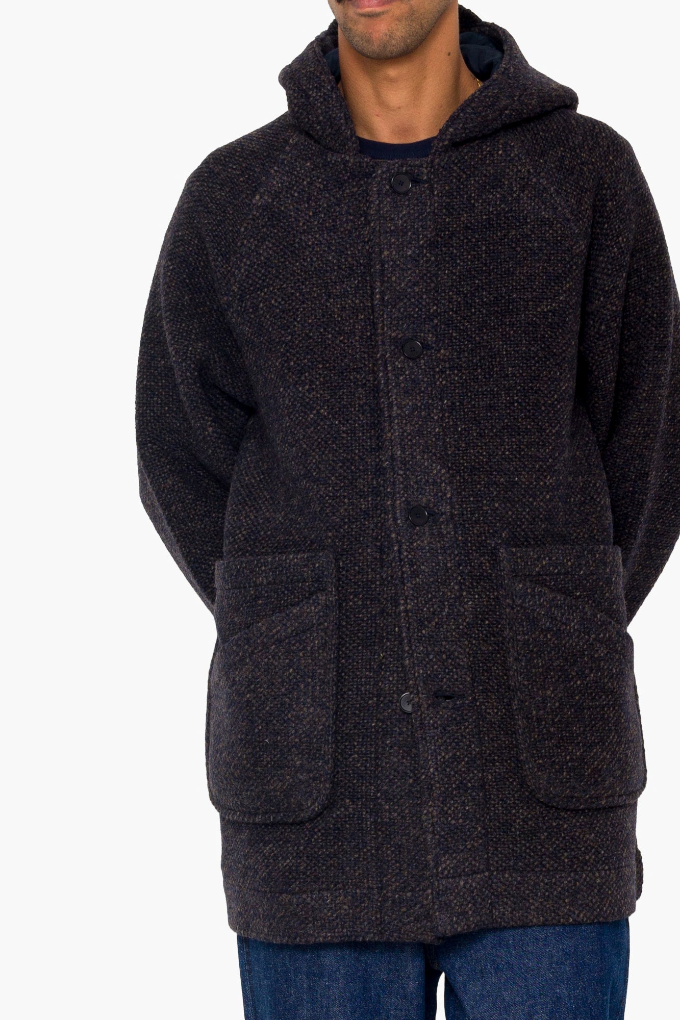 Our standard Car Coat, but fitted with a panelled hood and constructed in an Italian melange wool blend fabric with textured surface.