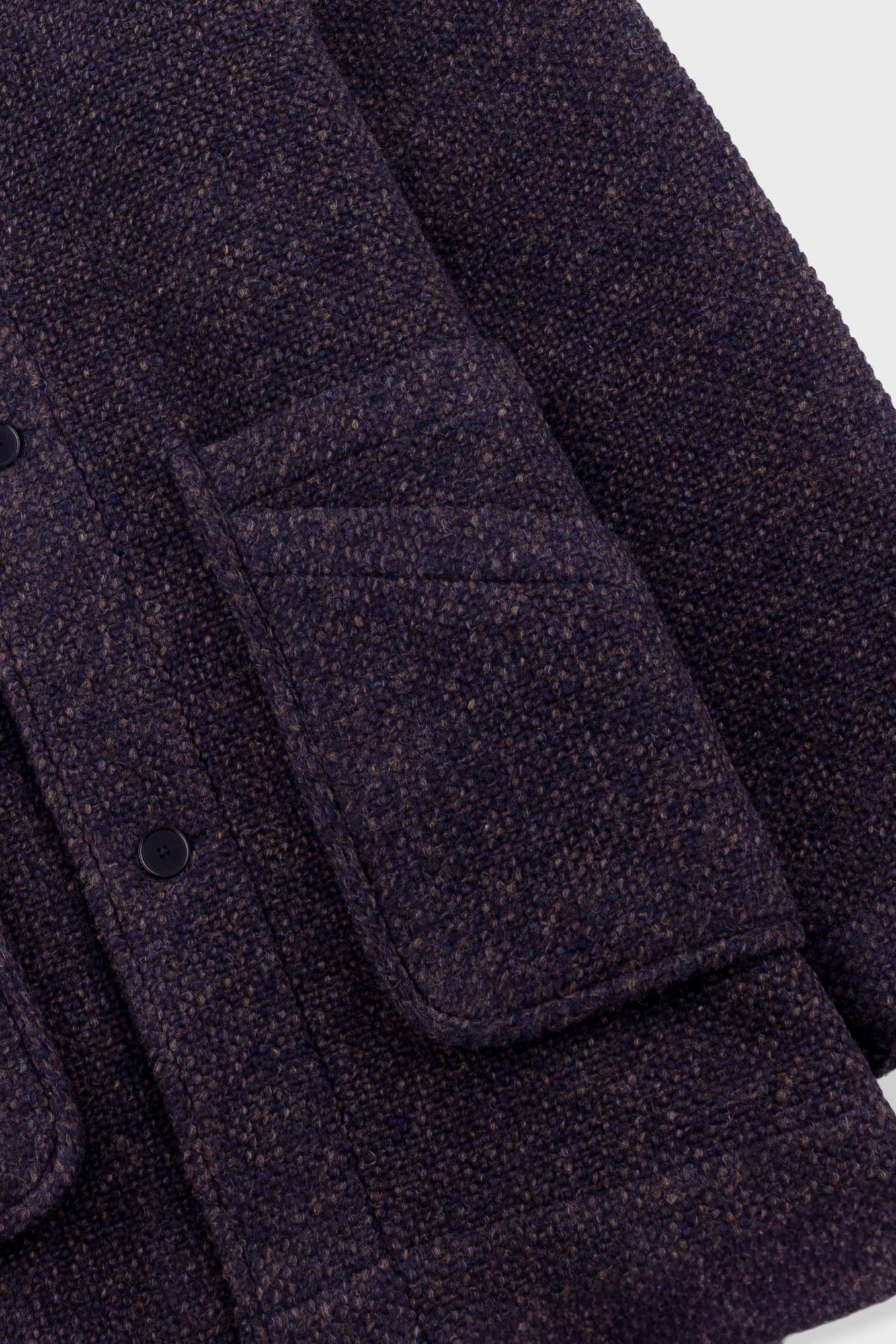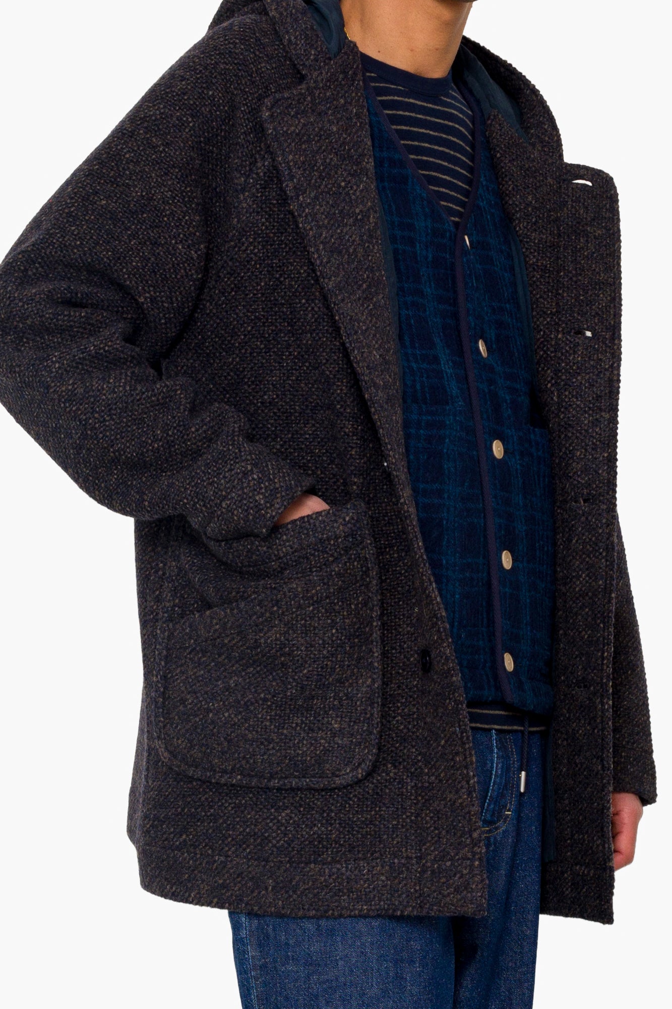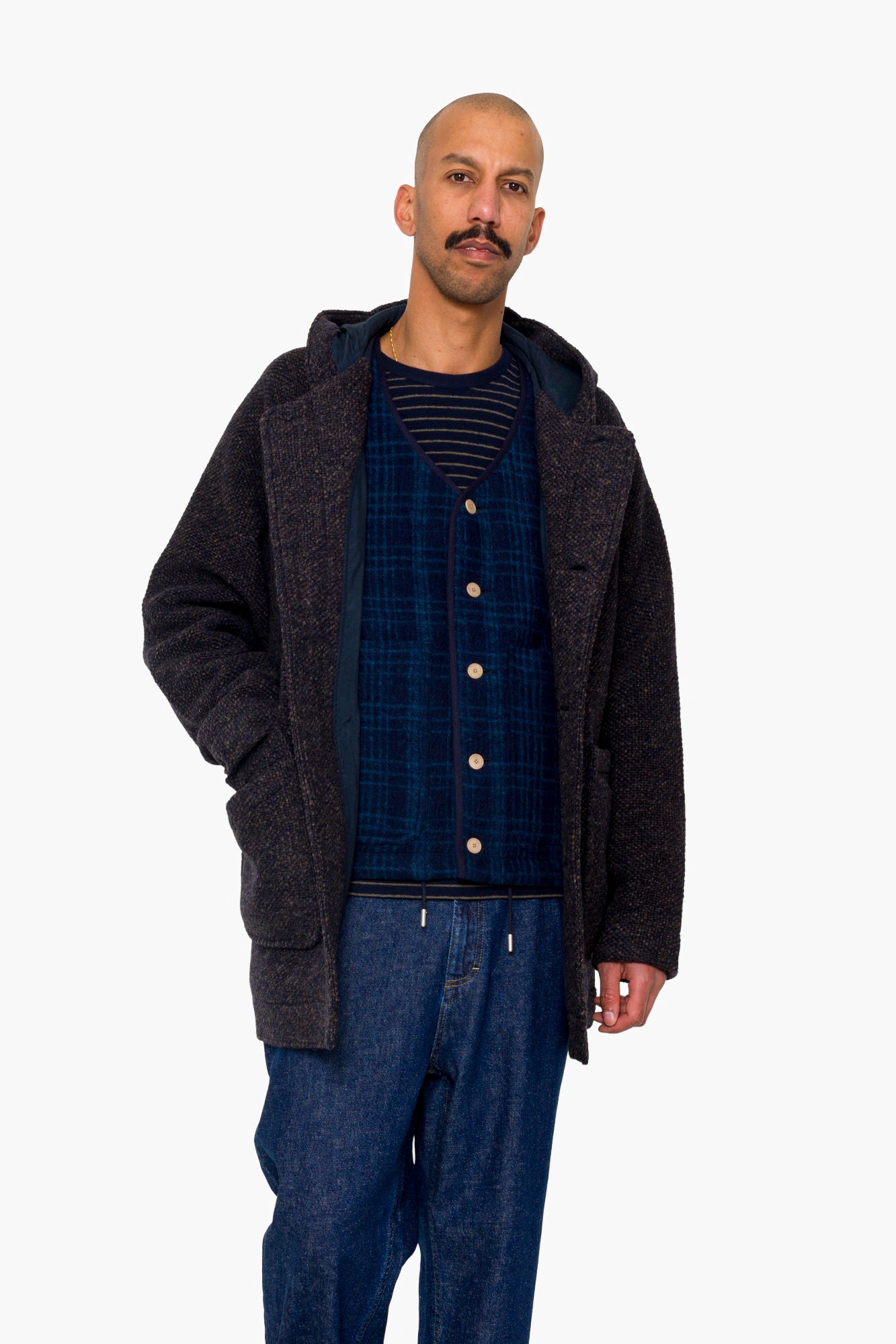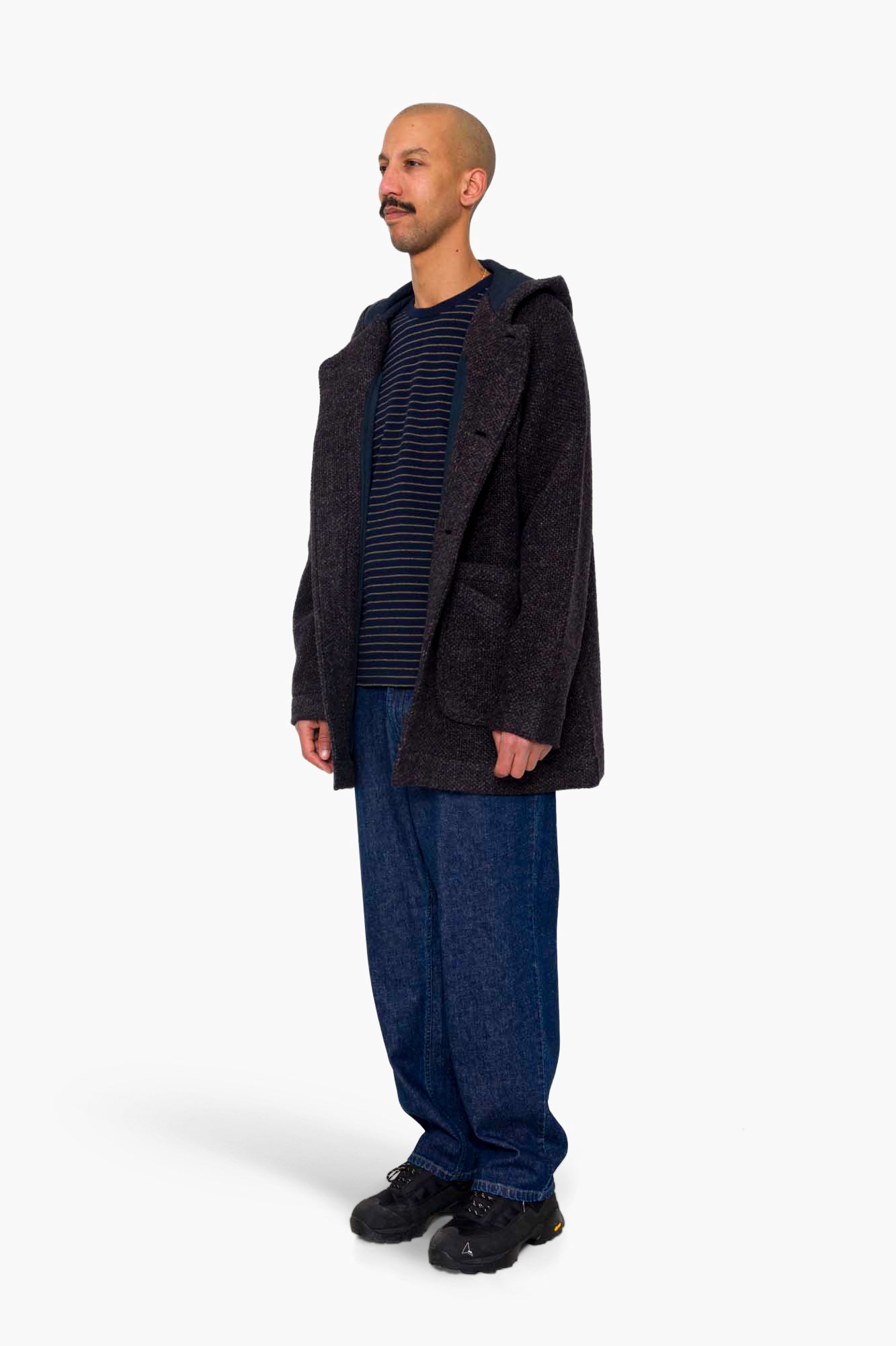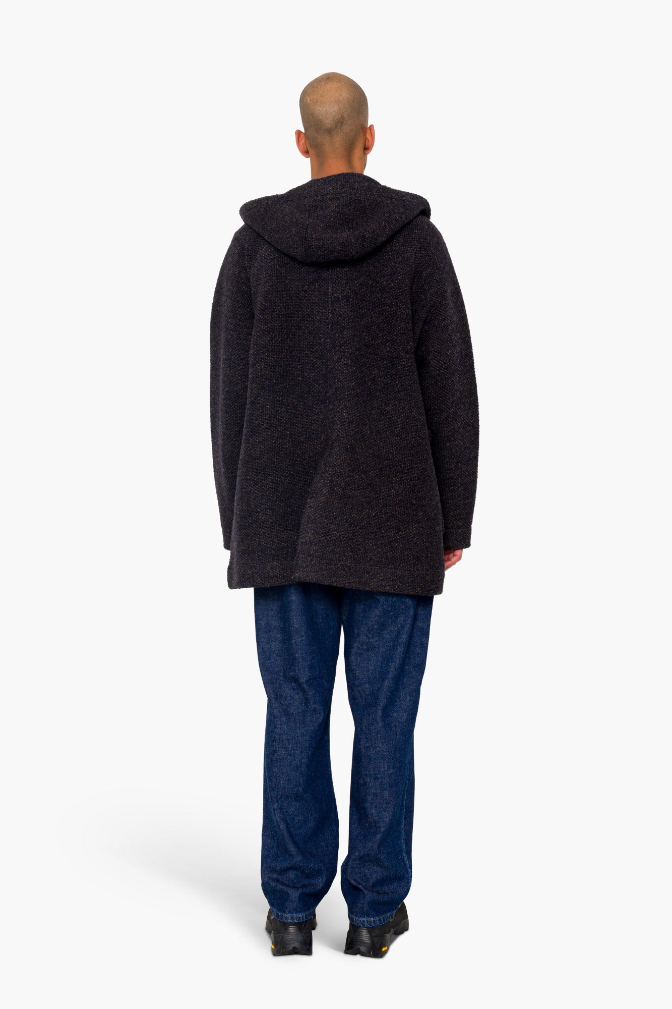 Our standard Car Coat, but fitted with a panelled hood and constructed in an Italian melange wool blend fabric with textured surface.