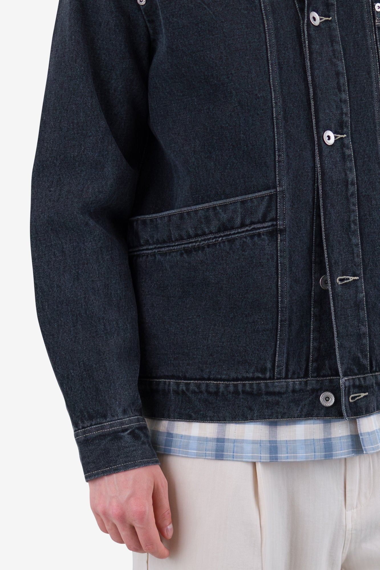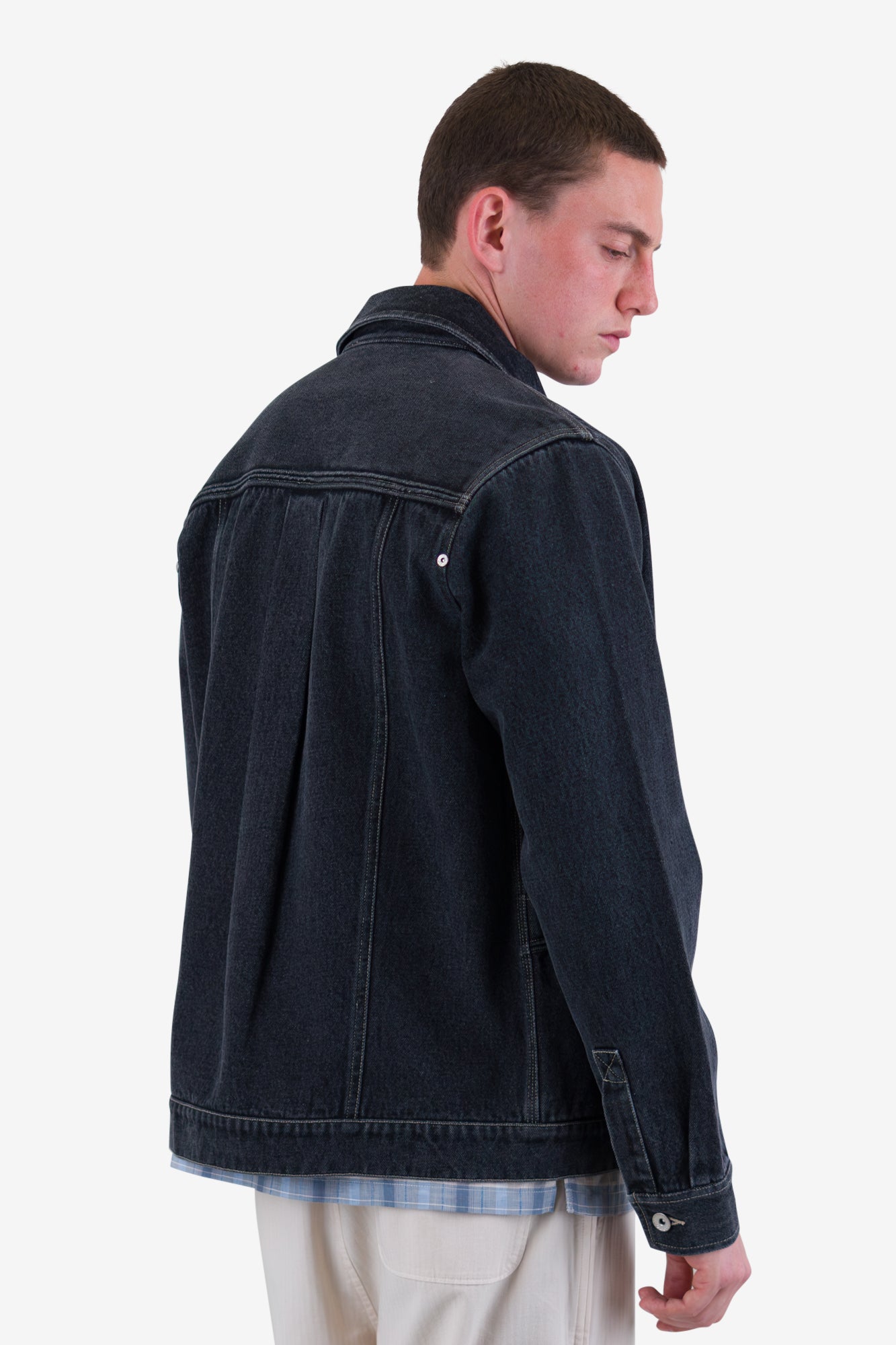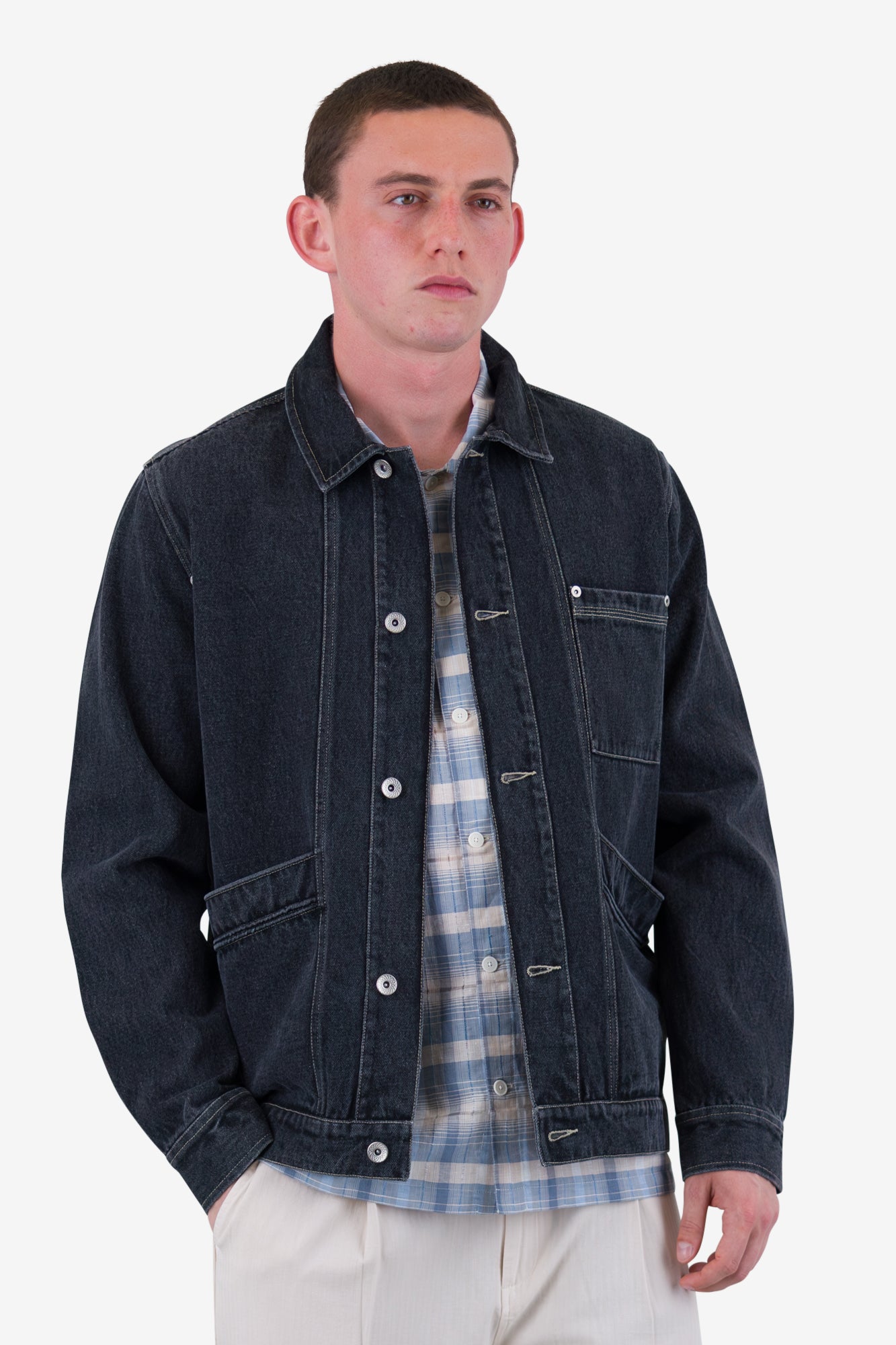 Our Meyer Jean Jacket is a heavyweight cotton denim jacket, finished with the same stitch details and angled pockets as our Meyer Shirt Jacket.