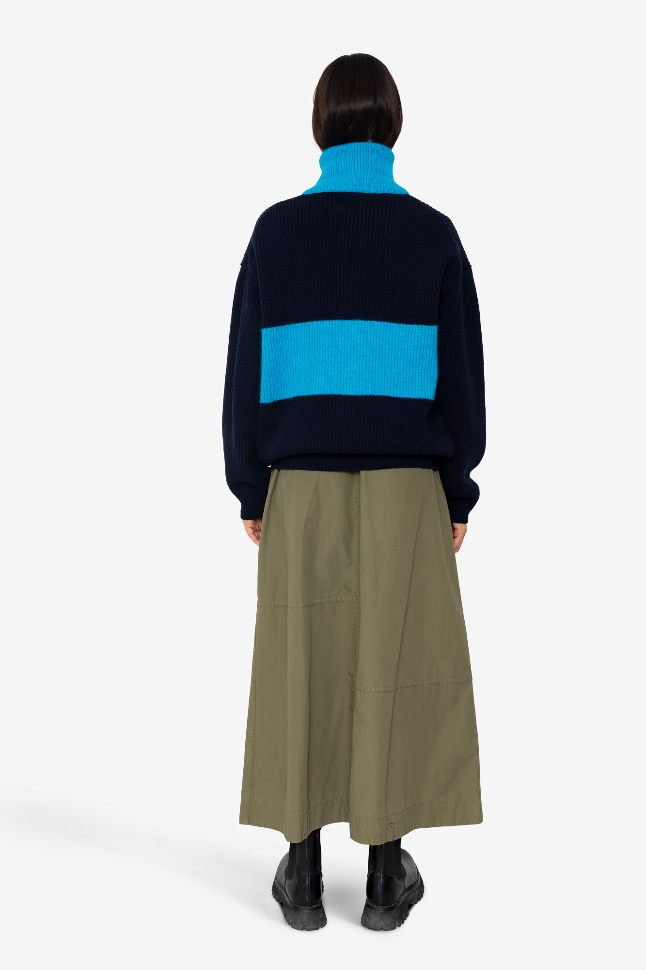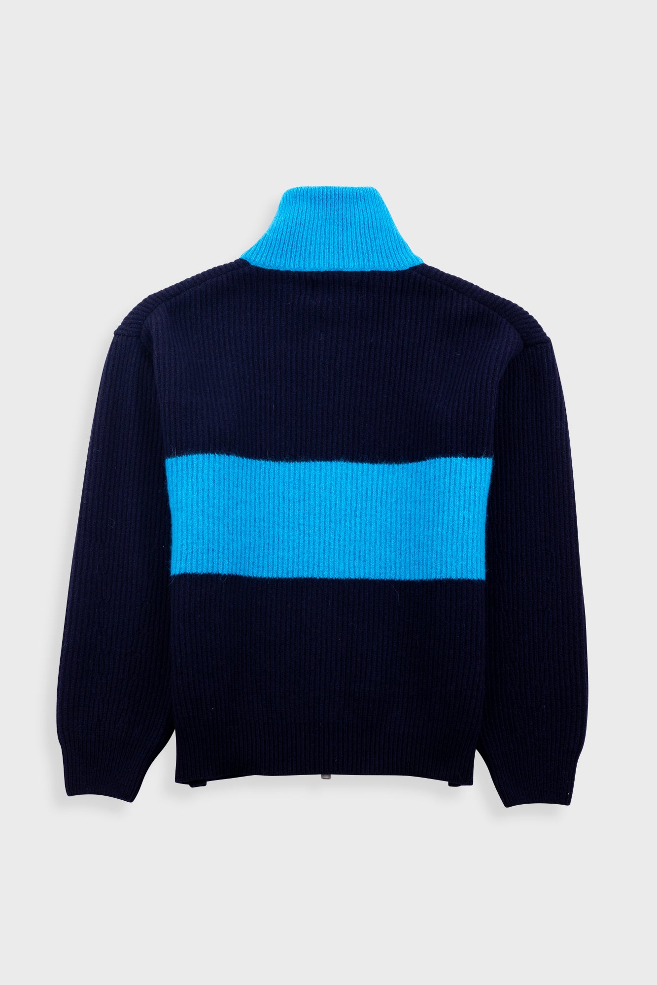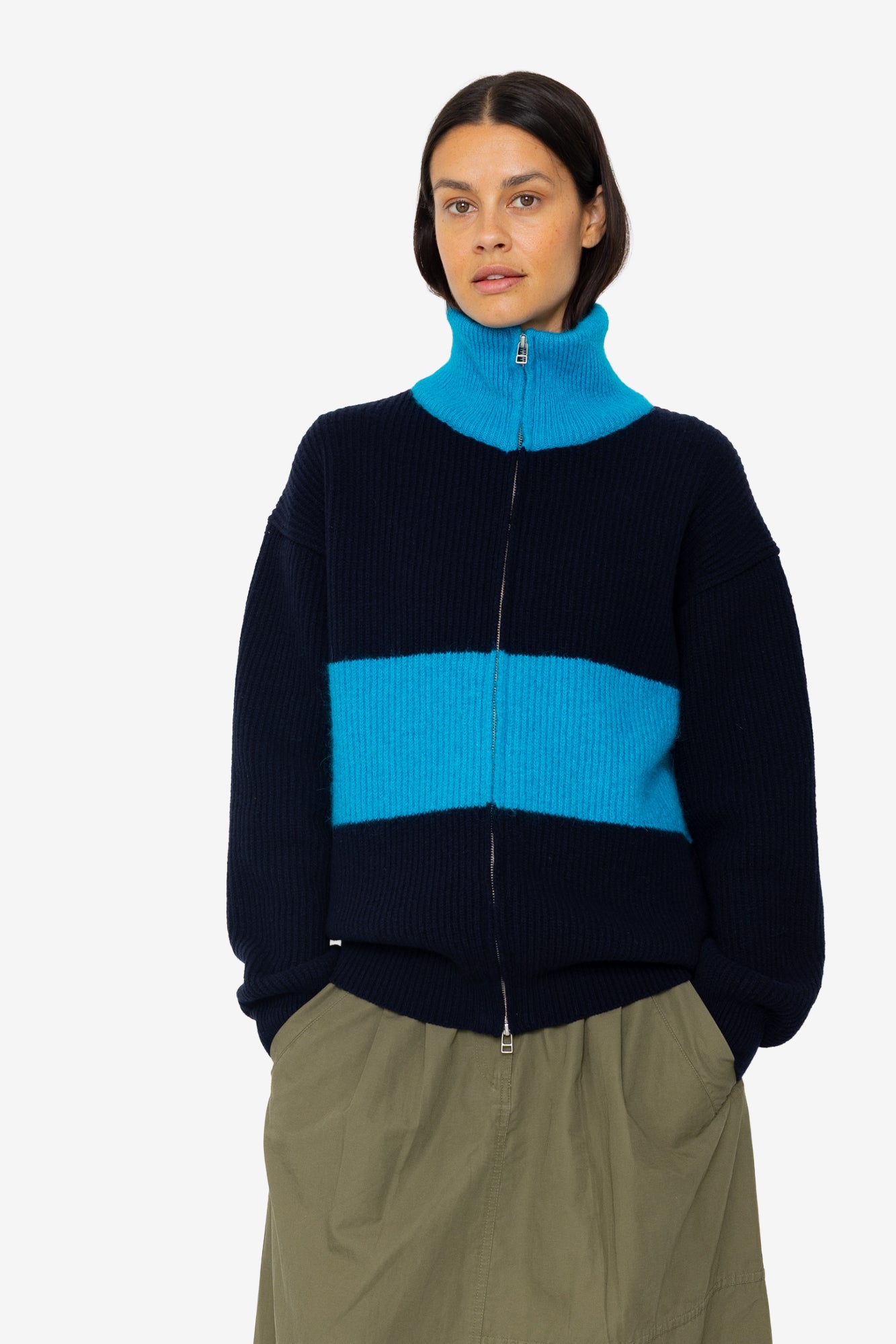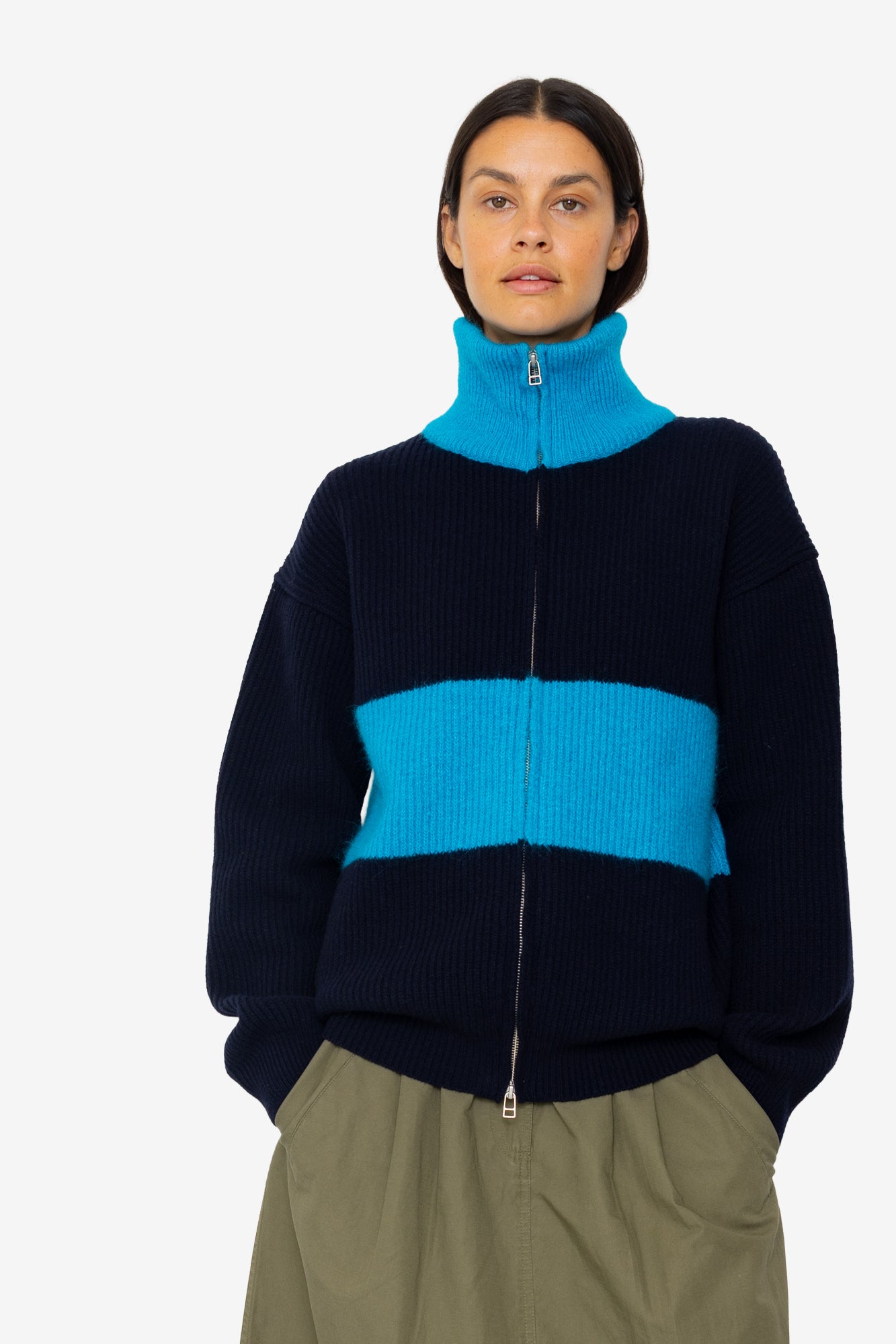 Our Zip Through Jumper has been cut boxy for a casual look and feel. It has been designed in two-tone block colour and features a double-ended zip.